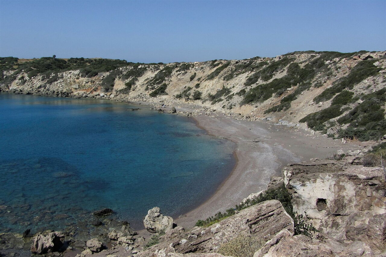 Hinter der scharfen Landspitze mit einer auffälligen, vom Wind geformten Steinskulptur erreichen wir die (05) zweite Traumbucht (3 m). Sie ist etwas felsiger und teilweise hat sich Müll angesammelt. Vorgelagerte Felsen erschweren den Gang ins Wasser. Wir gehen bis zum Ende der Bucht und steigen in einer Erosionsrinne auf die 30 m hohe Klippe. Dort orientieren wir uns zu den halb links liegenden Ruinen und auf der beginnenden Schotterpiste herunter zur Taverne.