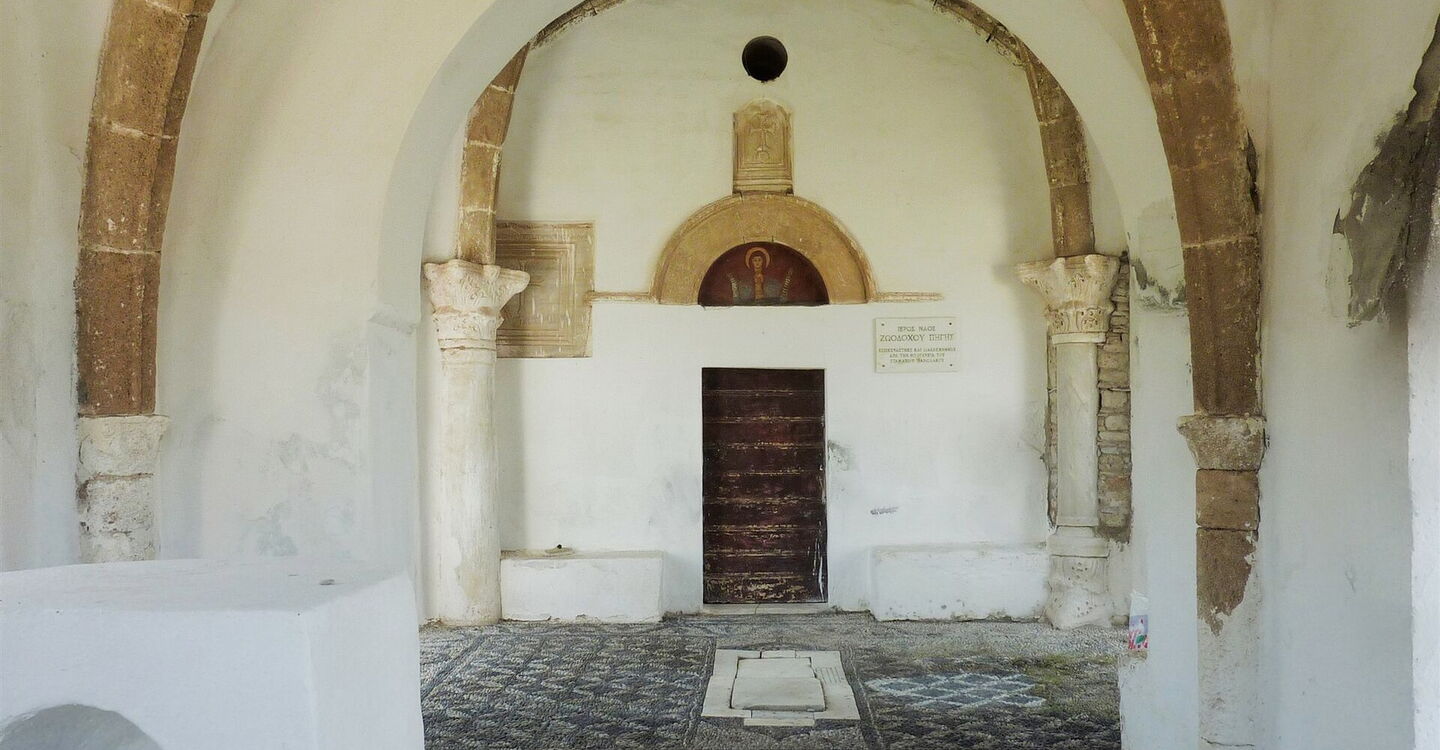 Vor oder nach der Wanderung sollte man auf jeden Fall die Kirche Zoodhochos Piji besichtigen. Sie befindet sich direkt hinter der Taverne. Dort wird man in den Wänden noch antikes Baumaterial entdecken. Geht man 10 m weiter in nördliche Richtung, so stößt man auch auf die Reste eines frühchristlichen Fußbodenmosaiks. Zur Wanderung: Vom (01) Fischrestaurant (10 m) gehen wir zunächst auf der Anfahrtsstraße zurück.