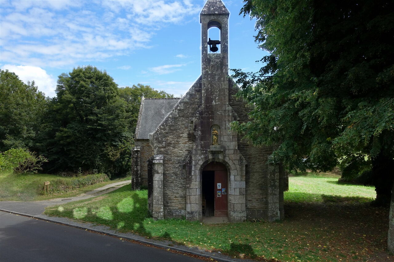 Hinter einem Informationsschild über die Vogelwelt und bei einem hölzernen Wegweiser gehen wir halb rechts bergauf und erreichen die im 16. Jahrhundert erbaute, im 19. Jahrhundert verfallene und 1865 wieder aufgebaute 03 Chapelle Notre-Dame-de-Lanriot (7 m). Die grün getäfelte Decke erinnert an die Form der Schiffsrümpfe und tatsächlich ist die Kapelle der Schutzpatronin der Seefahrer, der Jungfrau Maria, gewidmet. Wir steigen die wenigen Meter zum Nebenarm des Flusses wieder herunter und setzen den Weg fort, bis wir nach einer Holzbrücke landeinwärts gehen, also rechts bergauf. Nach kurzem, aber steilem Aufstieg überqueren wir die Straße nach halb rechts und laufen ein kurzes Stück auf einem Pfad, um dann den Weg auf der Asphaltstraße, der Cheminde la Riviére, fortzusetzen, bis sie endet.