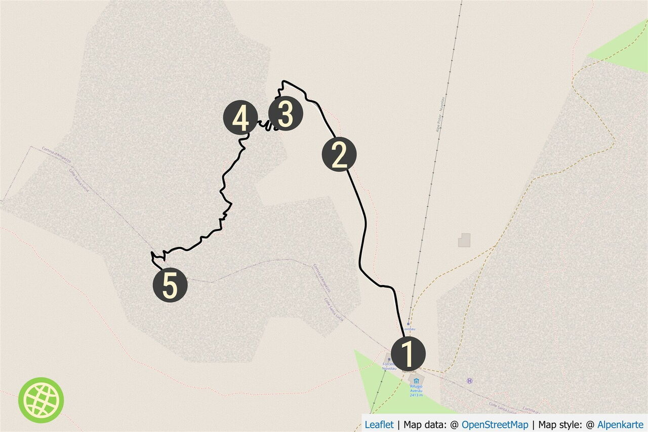 Von der 01 Forcella Nuvolau (2.416 m) und dem Rifugio Averau marschieren wir oberhalb der Bergstation des Sessellifts – vom Cinque Torre kommend – in nördliche Richtung. Unterhalb der Felsspitzen des Monte Averaus führt der Pfad dann über Geröllhalden.