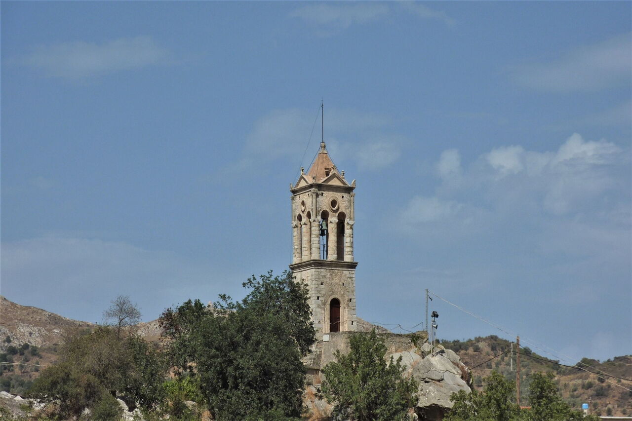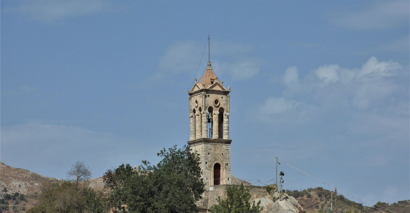 Wir gehen auf dem gleichen Weg zurück, halten uns bei der Weggabelung halb rechts und wechseln anschließend auf die bergauf führende Betonstraße, um dann nach 60 m rechts zu gehen. Angekommen im Dorf Opsigias geht es hinter der Kirche rechts hinunter auf die Asphaltstraße, bei der nächsten Möglichkeit links, nach 60 m links und sofort hinter der Kirche halb links – auf die ansteigende Piste. Im Dorf Amari endet unser Weg. Rechts sehen wir die wunderschöne, auf einen Felsen gebaute 03 Kirche von Agios Titos (461 m) – ein lohnenswerter Abstecher. Wir gehen 160 m links bergauf, die betonierte Straße geht in eine Asphaltstraße über, auch befindet sich hier ein einzeln stehender Wasserhahn. Wir biegen auf den alten Pfad links, dieser ist im weiteren Verlauf stark verwachsen und 6 aufeinanderfolgende Ziegengatter erschweren das Vorankommen. Auf der Asphaltstraße angekommen, wandern wir links an der Kapelle vorbei.