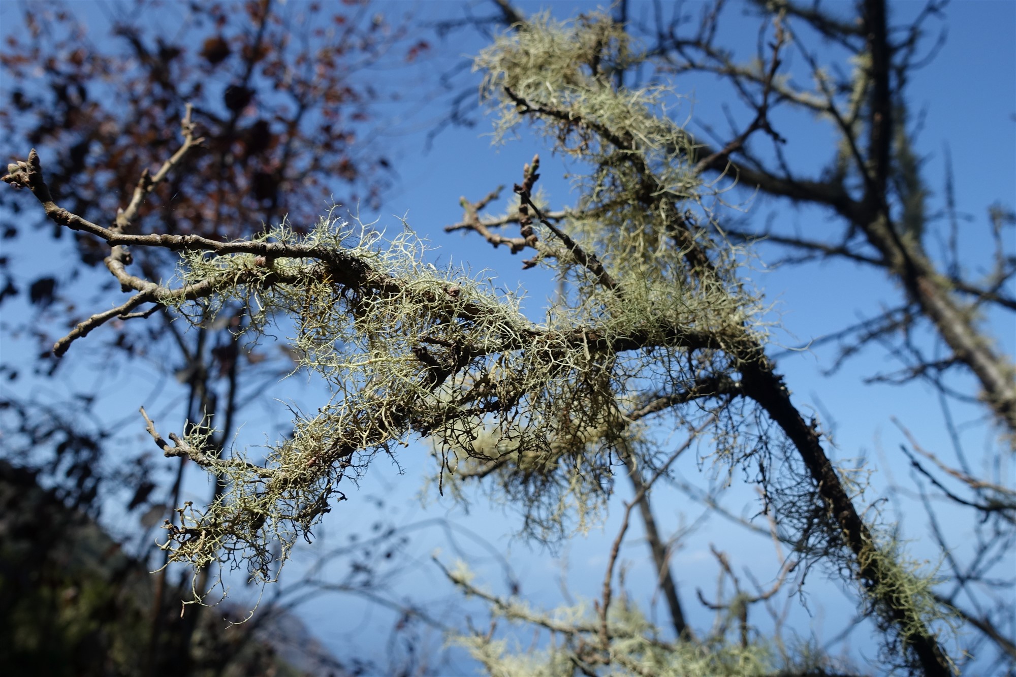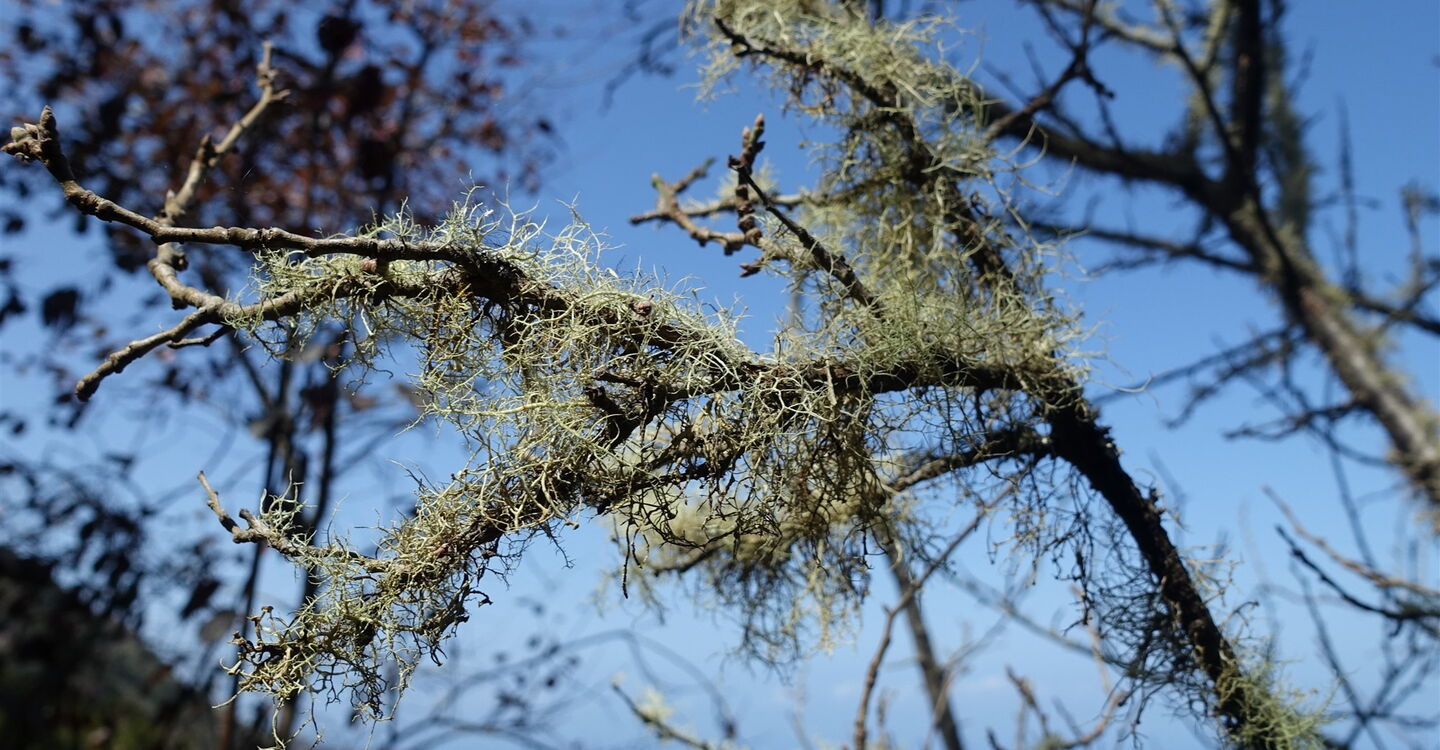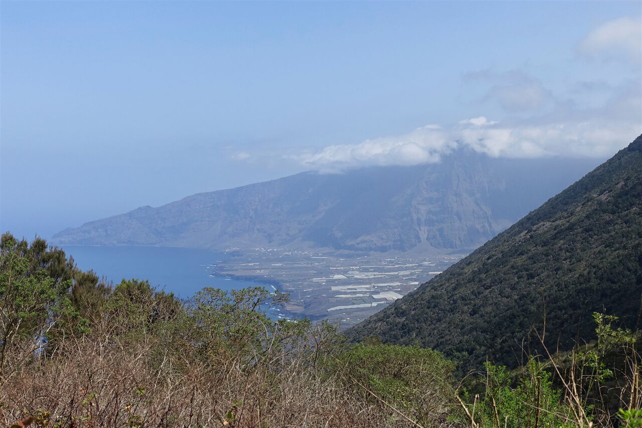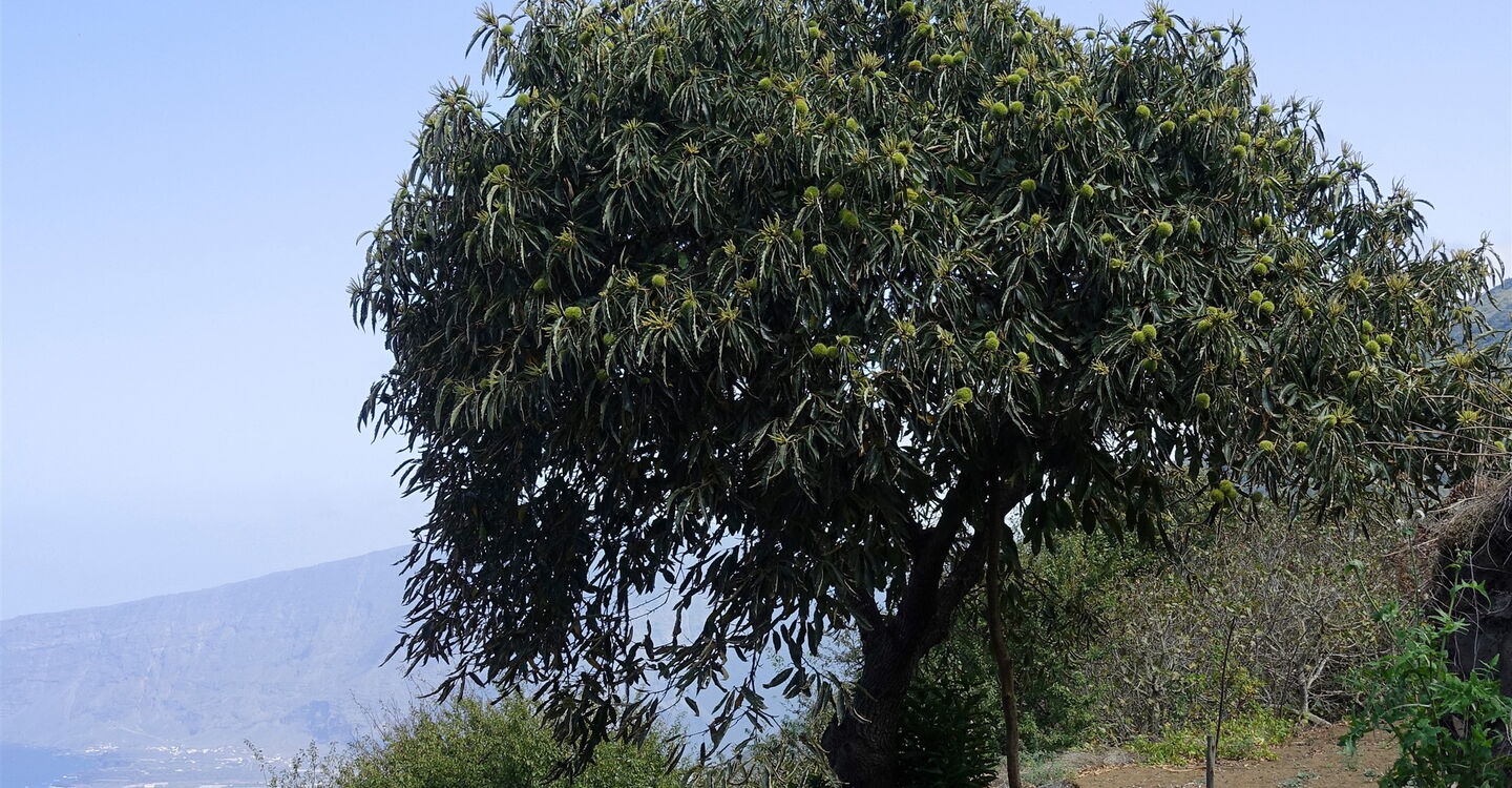 Kurz hinter einem grünen Gatter verlassen wir die Schotterpiste nach halb rechts. Auf dem (02) Camino Sabinosa (816 m), einem historischen Verbindungsweg zwischen den Orten Sabinosa und El Pinar, gehen wir bergab Richtung Pozo de La Salud. Obstbäume und üppiges Grün am Wegesrand zeugen von reichlich Wasservorkommen. Auch gibt der Wald immer wieder den Blick auf den Atlantischen Ozean und die umliegende Bergwelt frei.