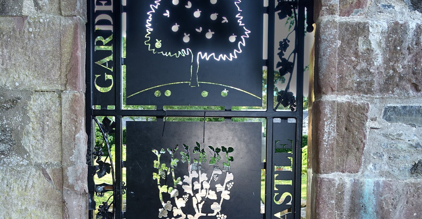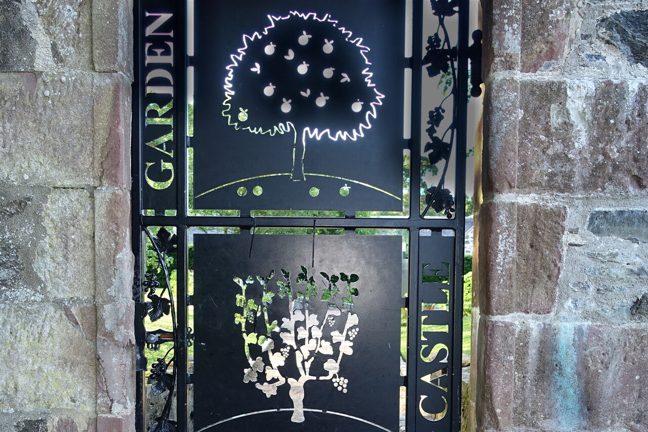 Vom Platz vor der Turmuhr am Schloss gehen wir nicht halb links bergab, sondern bis an die Weggabelung vom Hinweg vor. Hier gehen wir aber nun halb links an den Rhododendren vorbei. Hinter zwei Torbögen befindet sich auf der linken Seite der Eingang zum 04 Castle Garden (57 m). Solche mit einer hohen Mauer umfassten Gärten oder Höfe um mittelalterliche Abteien, Schlösser und Herrenhäuser wurden als Kräutergarten, Gemüsegarten und Obstgarten genutzt. Die hohe Mauer diente dazu, sie vor Wild und kräftigen Winden zu schützen. Wir queren den kostenpflichtigen Parkplatz und folgen dort dem gelben Wegweiser "Lochside Walk".