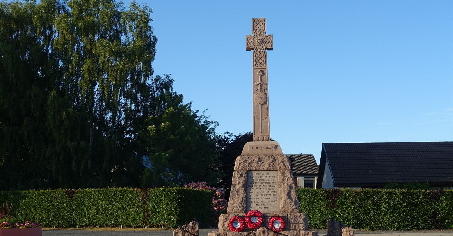 Von dem kleinen kostenlosen Parkplatz gegenüber dem Supermarkt in der Ortschaft 01 Fyvie (70 m) gehen wir auf der weiterführenden Straße an dem Denkmal für die Gefallenen aus dem Ersten Weltkrieg vorbei und biegen dann nach 75 m links in die Straße ab, die zum Fyvie Castle führt.
