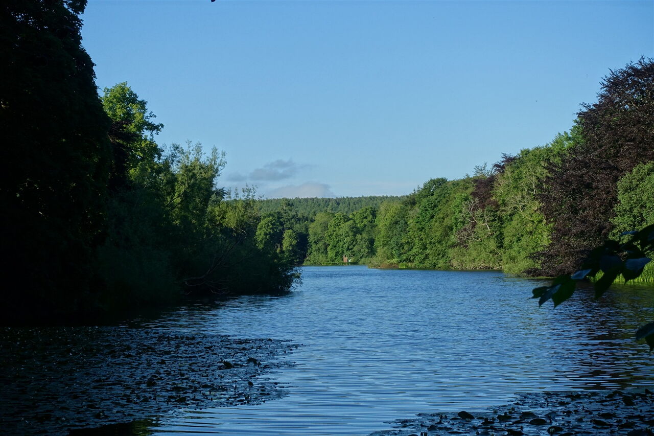 Gut 100 m hinter dem Schlosstor erreichen wir den 02 Loch of Fyvie (60 m) mit seinen Schwänen, Blesshühnern, Stockenten und Teichhühnern. Im Winter gesellen sich noch Graugänse, Reiherenten und Goldenten dazu, mit sehr viel Glück kann man einen Fischadler entdecken. Mächtige Bäume säumen den Pfad links der Straße und farbige Rhododendren sorgen für kontrastreiche Farbtupfer.