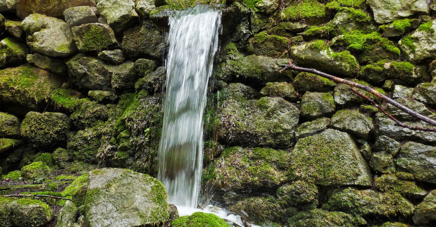 Nur einige Meter weiter rechts, etwas unterhalb, befindet sich die Quelle zur (03) Wasserversorgung (581 m). Auch heutzutage wird sie noch für das Hotel verwendet. Teilweise sehen wir auch links des Weges in den Berg geschlagene Tunnel. Diese dienten zur Unterbringung des Proviants, so war er in den heißen Sommermonaten gut gekühlt.