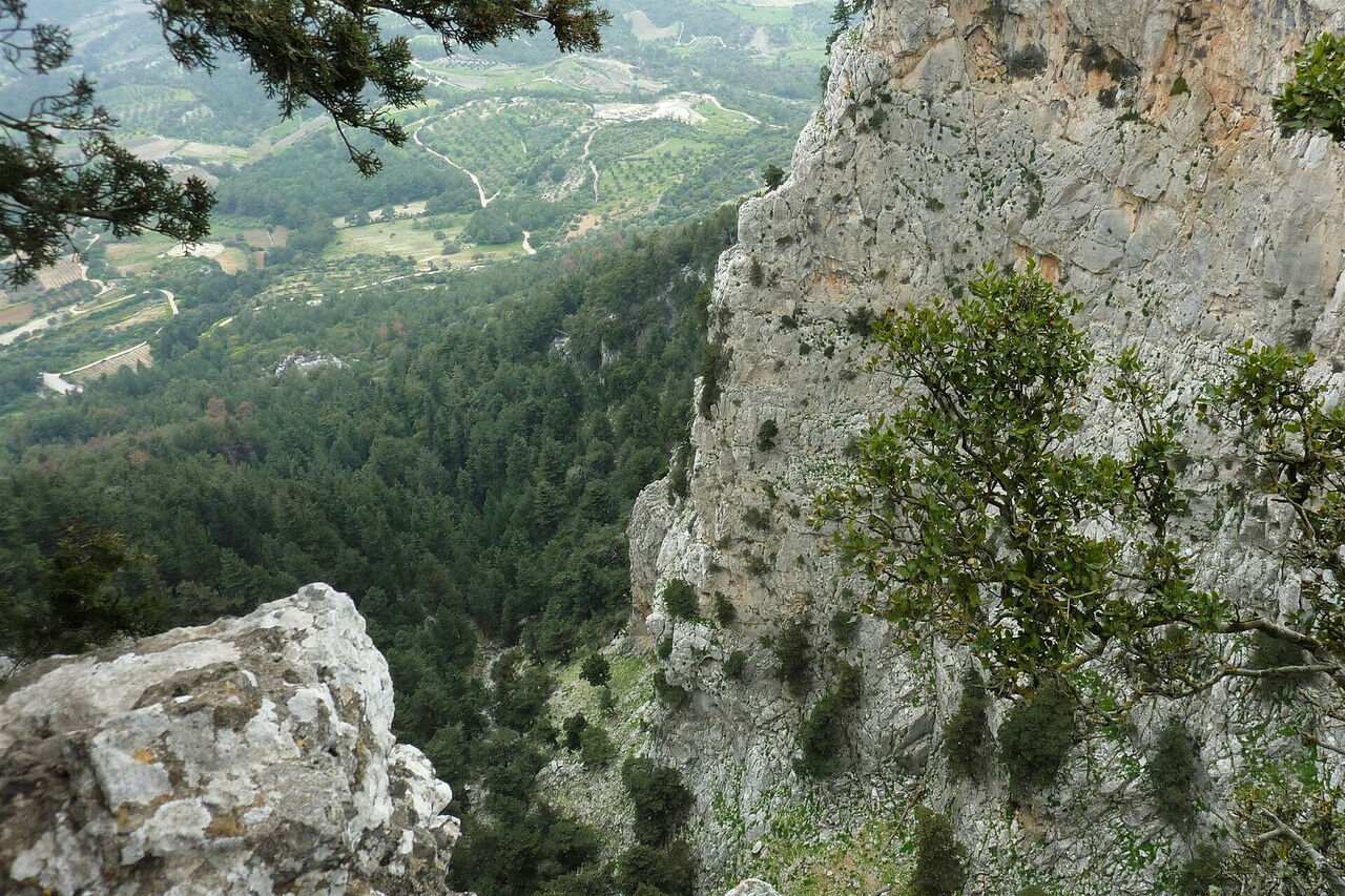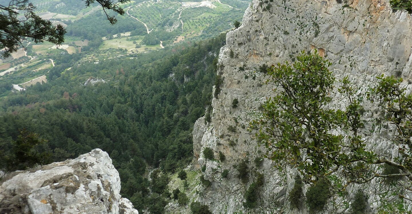 Wir wandern auf einer neu angelegten Piste, bis wir auf ein Steinmännchen treffen und hier halb rechts heruntergehen, nun ein kurzes Stück auf einem alten gepflasterten Weg in eine Senke hinunter. Bei einem weiteren Steinmännchen treffen wir wieder auf einen gepflasterten Weg, der direkt zu einem kleinen Bachlauf führt. Hier stand früher eine Brücke, wir halten uns rechts, immer oberhalb des Baubachlaufes, bis wir den (05) Aussichtsbalkon (615 m) erreichen. Vom Aussichtsbalkon ist nur noch die gemauerte Brüstung übrig, die Metallabsperrungen haben sich in den Abgrund verabschiedet. Daher ist an dieser Stelle Vorsicht geboten. Von der Galerie hat man eine eindrucksvolle Aussicht Richtung Nordwesten auf den 350 m unter uns liegenden Ort Salakos, die Ägäis sowie die Rhodos vorgelagerte Insel Symi und dahinter das türkische Festland.
