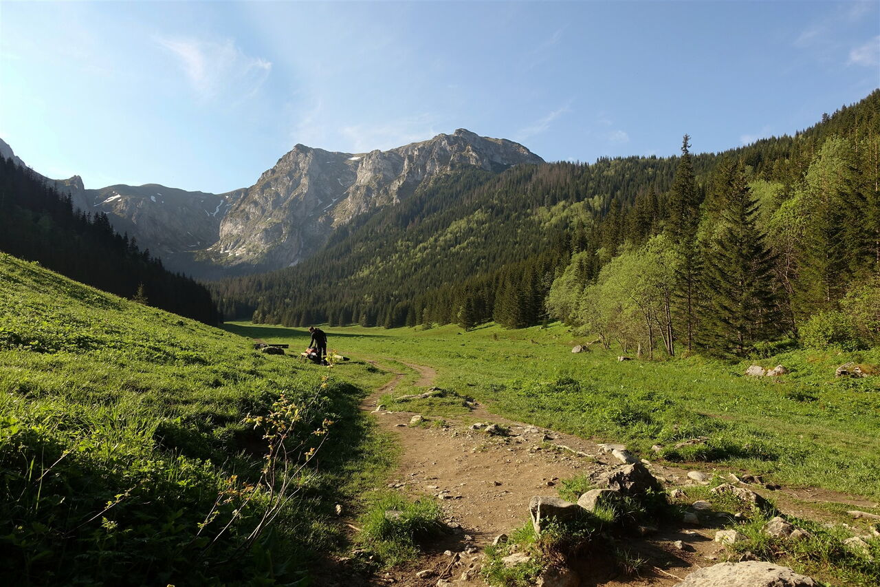 Wir erreichen die grünen und weiten Wiesen der oberen Dolina Małej Łąki und gehen an der 02 Wegekreuzung (1174 m) halb links. Das Tal, das durch die Gletscher der letzten Eiszeit geformt worden ist, ist im Frühjahr mit gelb blühenden Schlüsselblumen übersät. Am Talschluss sieht man bereits links oberhalb die mächtige Spitze des Giewont. Den halb rechts abzweigenden Pfad, der in ein Hochtal führt, lassen wir aus. Auf dem steinigen Pfad durch das Bachbett helfen gelbe Wegmarkierungen bei der Orientierung.
