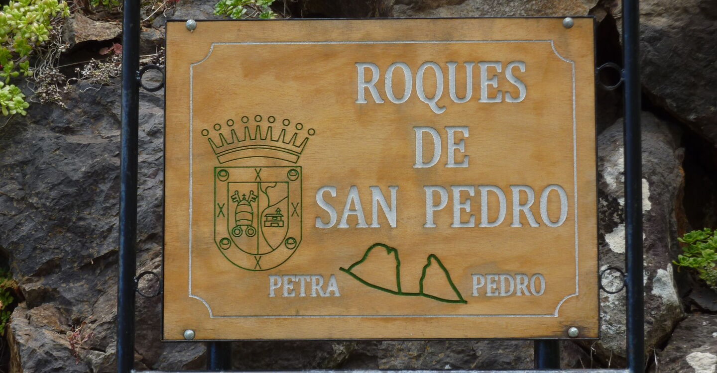 Am (01) Start und Ziel Iglesia de Santo Domingo de Guzmán (278 m) queren wir die Straße und folgen links bergauf den Treppen Richtung El Cedro. Nach einem kurzen, aber heftigen Aufstieg spazieren wir auf der Asphaltstraße rechts taleinwärts. Nach einer Linkskehre der Straße haben wir freien Blick auf die beiden Zwillingsfelsen. Wir stehen am Fuße des Roque Petro, der nun links von uns 150 m über der Straße aufsteigt.