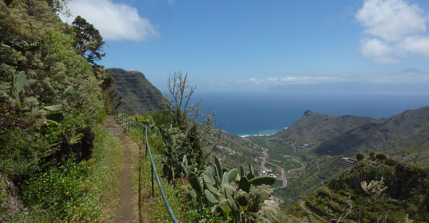 Die Wanderung startet beim Ethnografischen Museum in Hermigua - der Bananenhauptstadt von La Gomera. Über terrassenförmigen Plantagen führt der Anstieg bis zum extrem steilen und spektakulären Aufstieg auf den Lomo Gordo, wo man mit unvergesslichen Blicken über das 6 km lange Ober- und Unterdorf von Hermigua - bis hin zum Atlantischen Ozean - belohnt wird. Es folgt ein Höhenweg für Naturliebhaber, bis der Weg sich wieder gen Tal neigt und wir eine weitere Sehenswürdigkeit besuchen: die Ermita de San Juan (Las Cabezadas) aus dem letzten Jahrhundert. Durch die exponierte Lage 240 m oberhalb von Hermigua ist dies ohne Zweifel eine Must See Location.