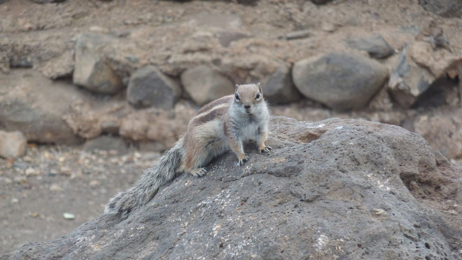 Nach Erkundung zweier riesiger vom Wind geformter Dünen wird der folgende Strandabschnitt schmaler und bei Flut gibt es kleinere Kletterstellen über Kieselsteine. An der einsamen Strandbucht des Playa El Salmo wird die Mündung des Barranco los Canarios gequert. Im weiteren Verlauf führt der Weg vorbei an Steinburgen bis zum nächsten Strand, dem Playa del Mal Nombre mit dem gleichnamigen Barranco. Dann sehen wir bereits aus der Ferne die vielen Sonnenschirmreihen des Playa de Esquinzo Butihondo, nahe der Urbanisation Esquinzo. Oberhalb der Klippen liegt das Hotel Paraiso Playa. 150 m hinter der Hotelanlage, direkt am Strand, sehen wir ein altes, verfallenes Gebäude. Wir gehen rechts zu einem Parkplatz, wo sich beinahe zahme (03) Atlashörnchen (14 m) angesiedelt haben.