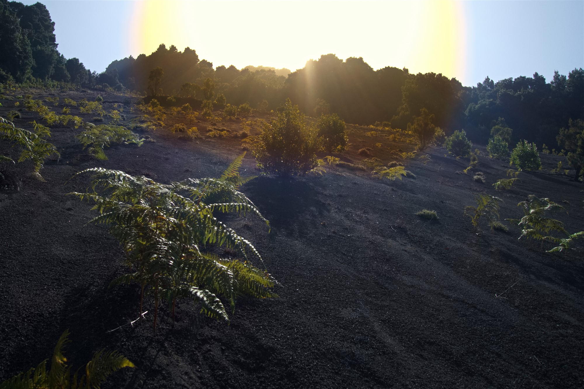 450 m hinter einem schwarzen Lapilli-Feld, das sich den Hang hinaufzieht – die Piste macht hier eine leichte Rechtskehre –, erreicht man weglos halb links über Vulkangestein einen wunderschönen Aussichtspunkt. Wir setzen unseren ursprünglichen Weg fort. Auf der Verbindungsstraße (03) HI-1 (1053 m) gehen wir 60 m links Richtung Frontera, um dann rechts auf die betonierte Piste zu biegen. Diese geht in eine Sandpiste über und bei der Weggabelung gehen wir halb rechts über die Absperrkette. Auf dem nachfolgenden Wegstück ist der Wald besonders dicht gewachsen und die Bäume sind sehr hoch – ihre Blätter bilden einen zweiten Himmel.