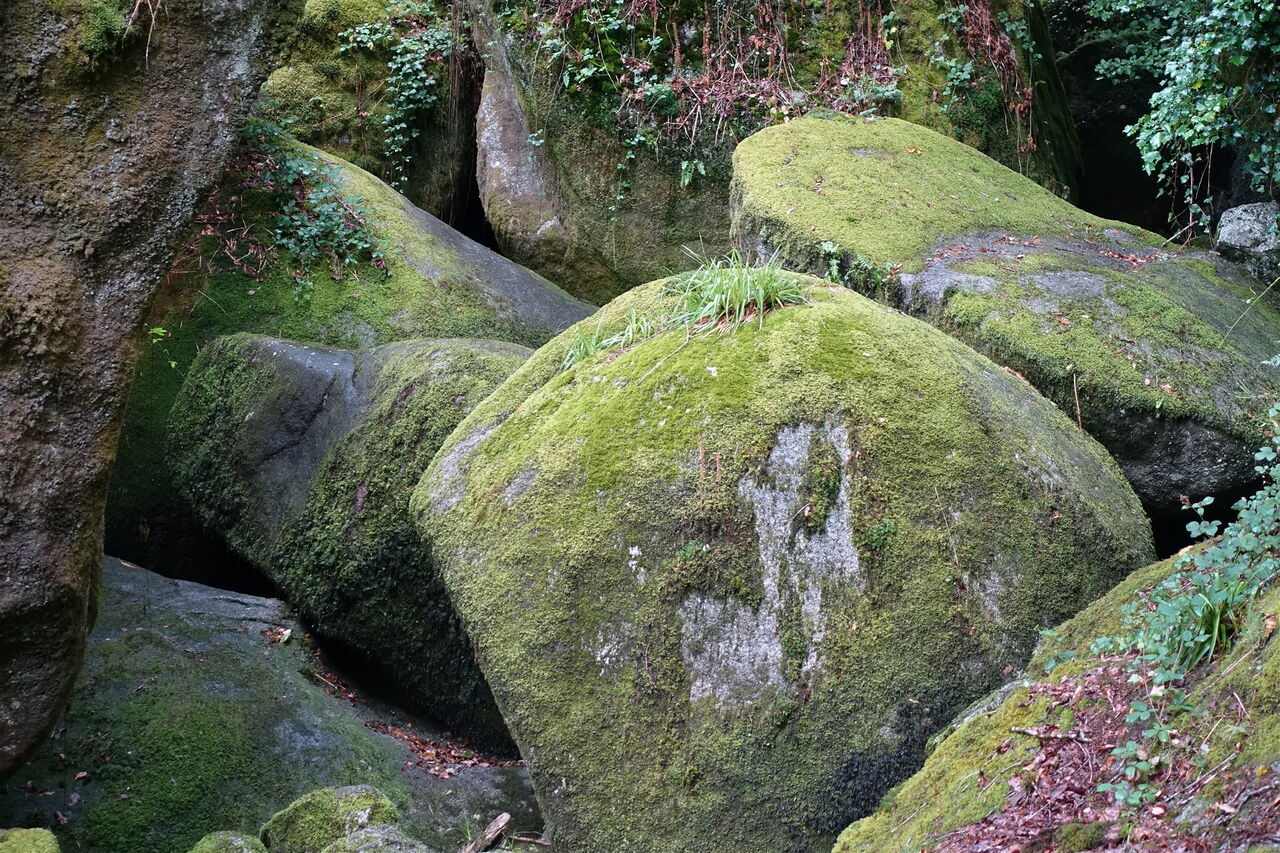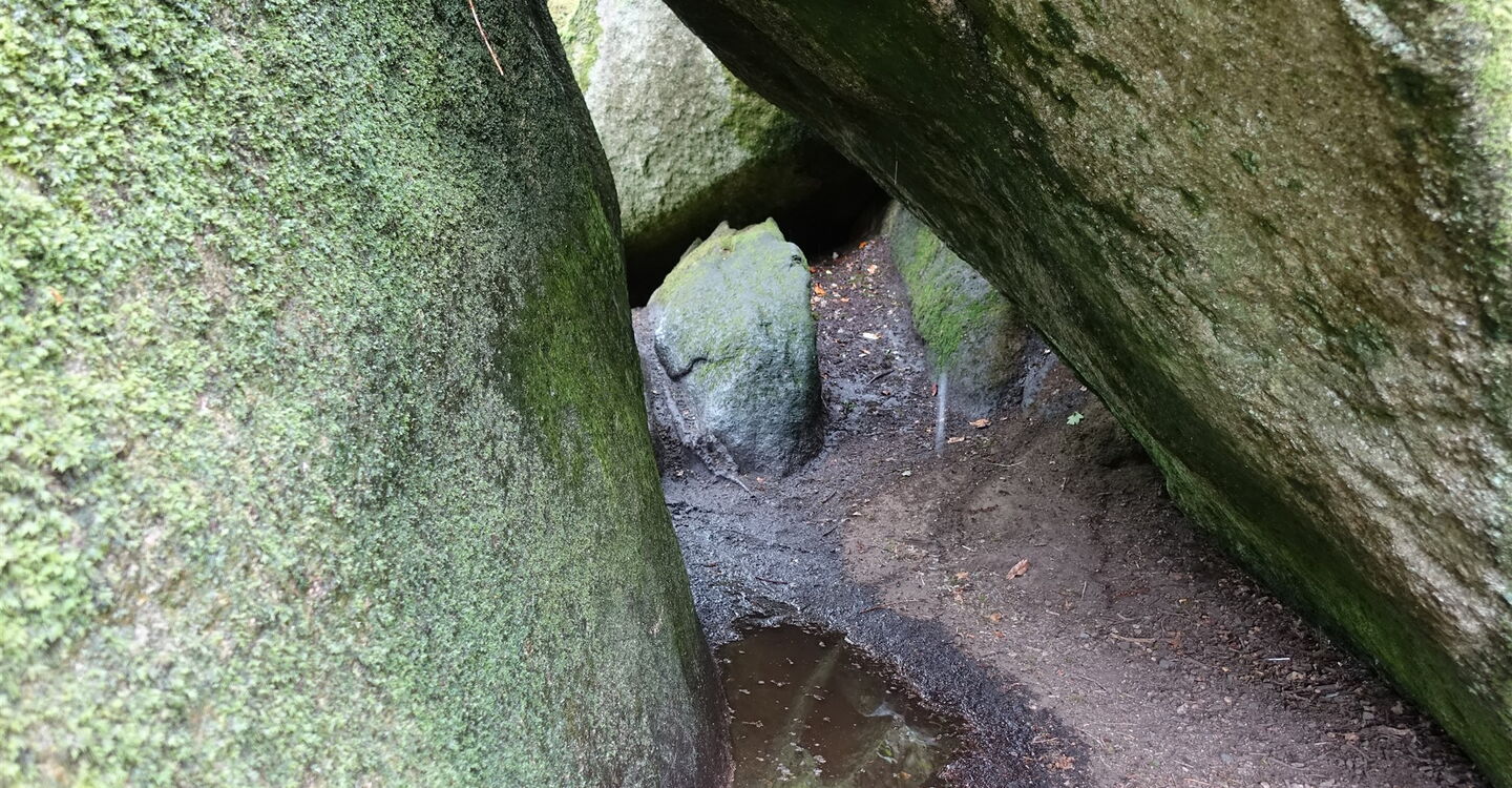 Vom Parkplatz – Start und Ziel der Wanderung – hinter der aus dem Jahr 1591 stammenden Église Saint-Yves de Huelgoat gehen wir bis zum Place Aristide Briand vor und dort rechts durch die Straße bis zum See. Hinter der Brücke befindet sich die alte Mühle Moulin du Chaos. Sie wurde 1339 erbaut und ist das älteste Gebäude in Huelgoat. Wir gehen bei der Crêperie rechts auf dem Pfad weiter. Zwischen den mit Moos bedeckten, riesigen Felsen hindurch erreichen wir die Grotte du Diable (Teufelsgrotte), bei der man über eine rutschige Eisentreppe in die Unterwelt absteigen kann. Auf dem weiterführenden Pfad geht es an mächtigen und rund geschliffenen Granitblöcken vorbei. Bei der ersten Weggabelung gehen wir dann halb links, überqueren den inzwischen unterirdisch verlaufenden Bachlauf und nehmen den ersten Treppenaufstieg, der an einer kleinen Höhle vorbeiführt. Über einen platt geschliffenen Felsen und in den Fels geschlagene Stufen gelangen wir zum 01 Roche Tremblante (164 m) herunter. Der sogenannte zitternde Felsen liegt auf einem schmalen Grat. Findet man den richtigen Druckpunkt in Kombination mit der richtigen Frequenz, so wird der 100 t schwere Granitblock in eine 2 bis 3 cm weite Schwingung versetzt! Bloß wo ist der Punkt?
