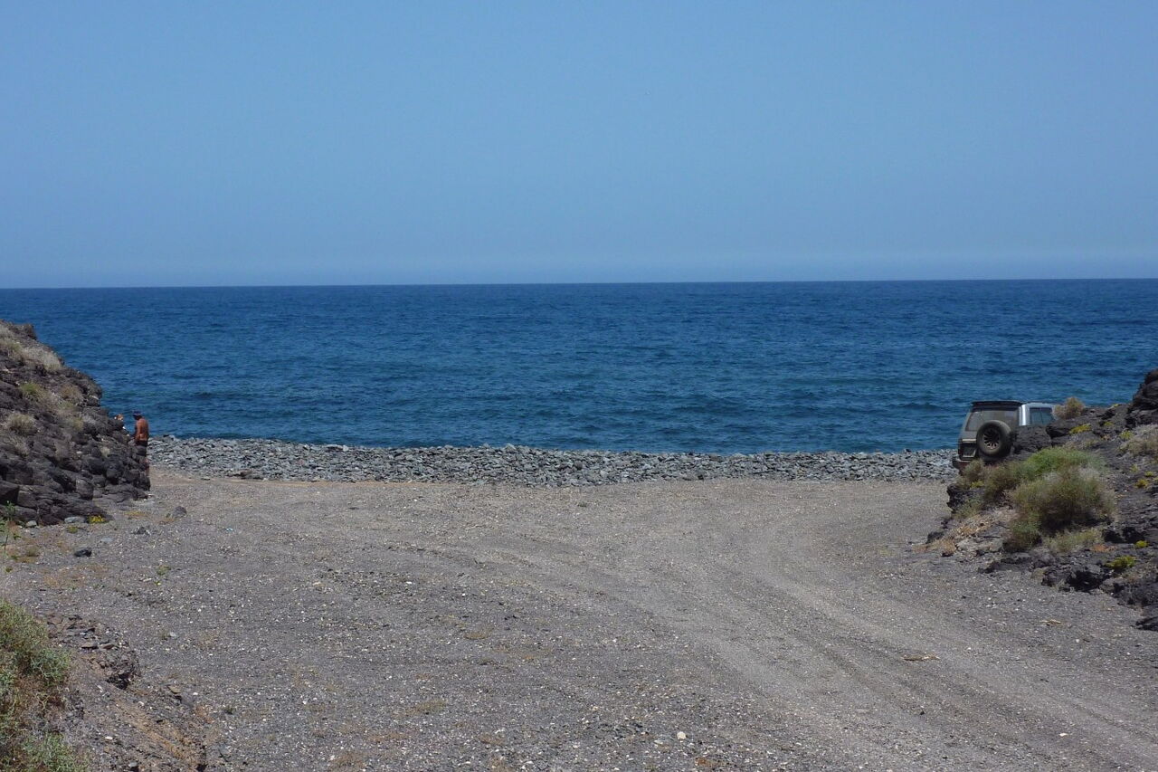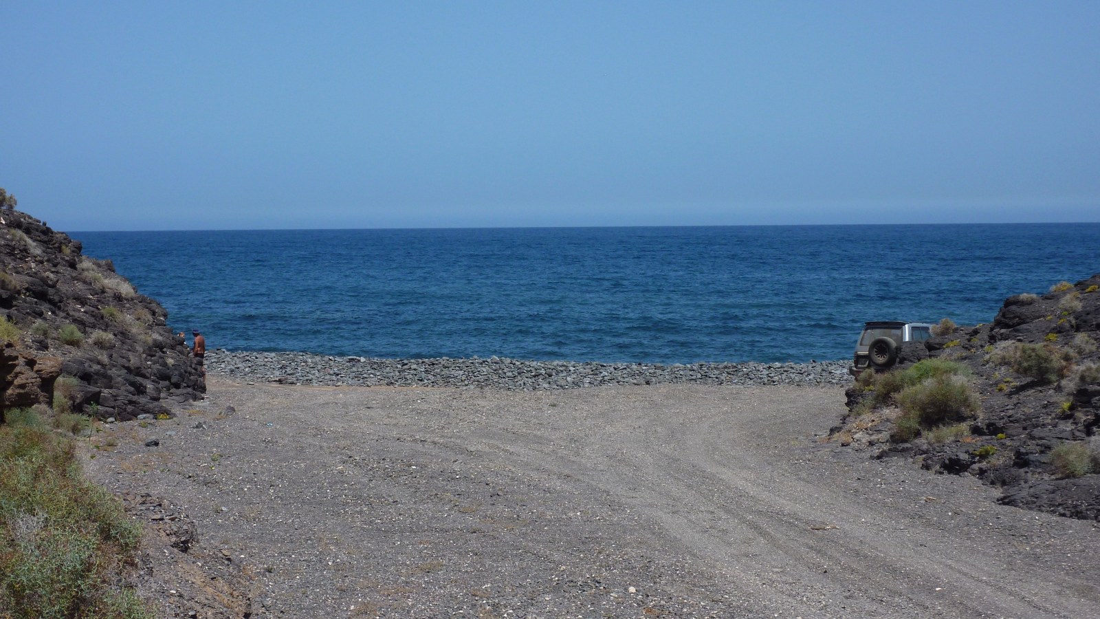 Auf diesem Bergrücken gehen wir nun weglos bergab. Während der nächsten 3,3 km wandern wir immer auf dem höchsten Punkt des Bergrückens. Nur 100 m vor dem Meer steigen wir in das Barranco hinab, welches uns zu einer Bucht führt. Da diese Bucht bisher in keiner Literatur erwähnt ist, gebe ich ihr ganz emotionslos den Namen (03) Playa Ajaches Nationalpark 5 (2 m).