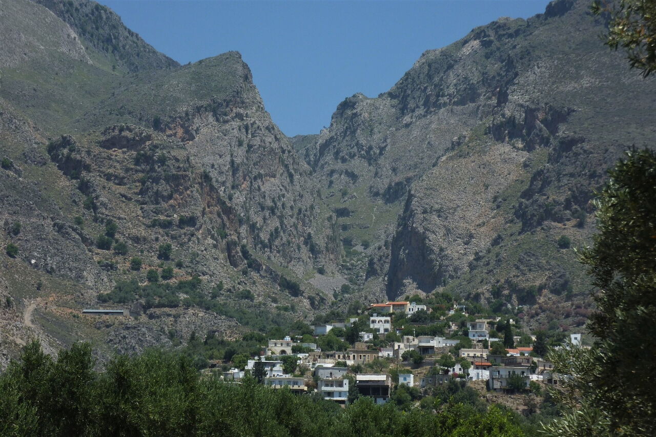 In Kallikratis gehen wir von dem Café 01 Wild Herbs (710 m) auf der Asphaltstraße Richtung Frangokastello. Nach 1,9 km, die Straße steigt wieder mäßig an, biegen wir halb rechts auf den ausgezeichneten Pfad E4, der uns in die Schlucht von Kallikratis führt. Wir wandern auf einem wunderschön angelegten Steinpfad durch die Schlucht. Er verband die Weideflächen in den Bergen bei Kallikratis mit den Dörfern in der Talebene. An der engsten Stelle ist die Schlucht nur 10 m breit, bis zu 250 m überragen die seitlichen Felswände das Bachbett, in der Ferne sieht man das azurblaue Meer.