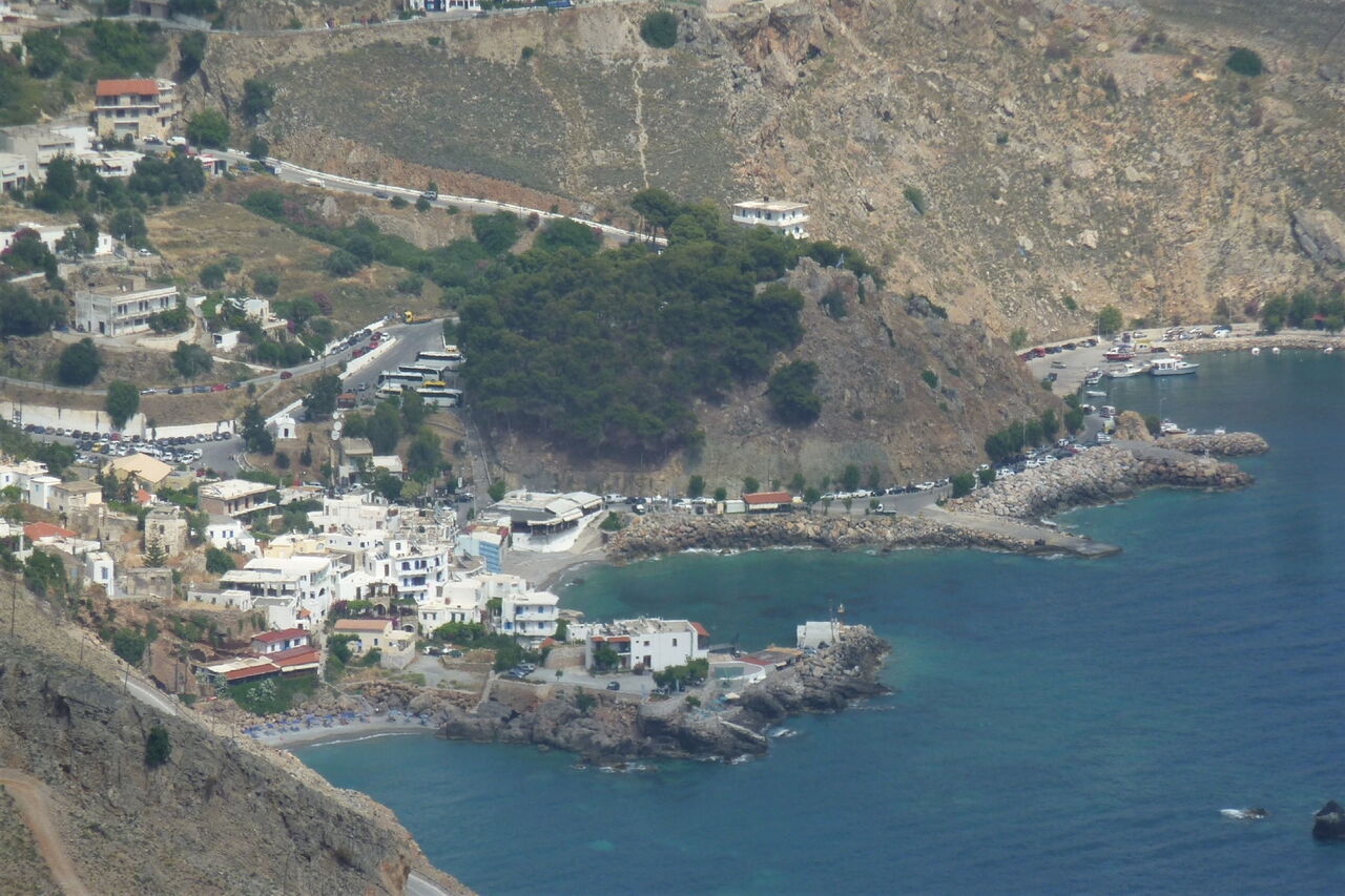 Auf der Piste erreichen wir eine Ziegenhaltung. Auf dem nachfolgenden weglosen Stück wandern wir in Richtung eines Felsens am Horizont, der aussieht wie ein Pilz. Auf einem Küstenpfad queren wir eine Schotterpiste, kommen vorbei an einer weiteren schönen Bucht und erreichen oberhalb vom Filaki-Strand – wohlbekannt unter Anhängern der Freikörperkultur – eine Asphaltstraße. Dieser folgen wir bergauf, gehen bei der folgenden Weggabelung halb rechts und erreichen die Hauptstraße. Nach 1,4 km auf der Hauptstraße gelangen wir zu unserem heutigen Etappenziel 05 Chora Sfakion (16 m).