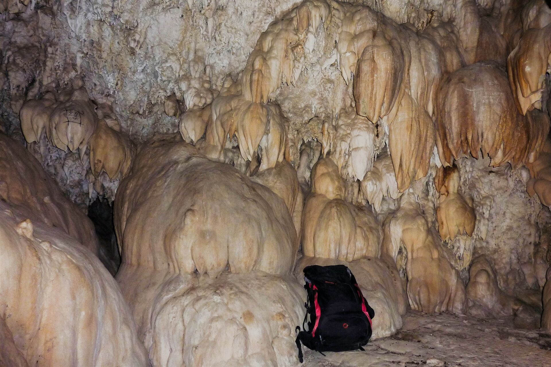 Wir überqueren den Bachlauf und gehen auf dem Trampelpfad oberhalb des Bachlaufs, bis wir auf eine große Gumpe treffen. An dieser Stelle klettern wir im Bachbett bergab, bis wir auf der linken Seite die (03) Tropfsteinhöhle (123 m) sehen. Nach Regenphasen sind die Felsen extrem rutschig.