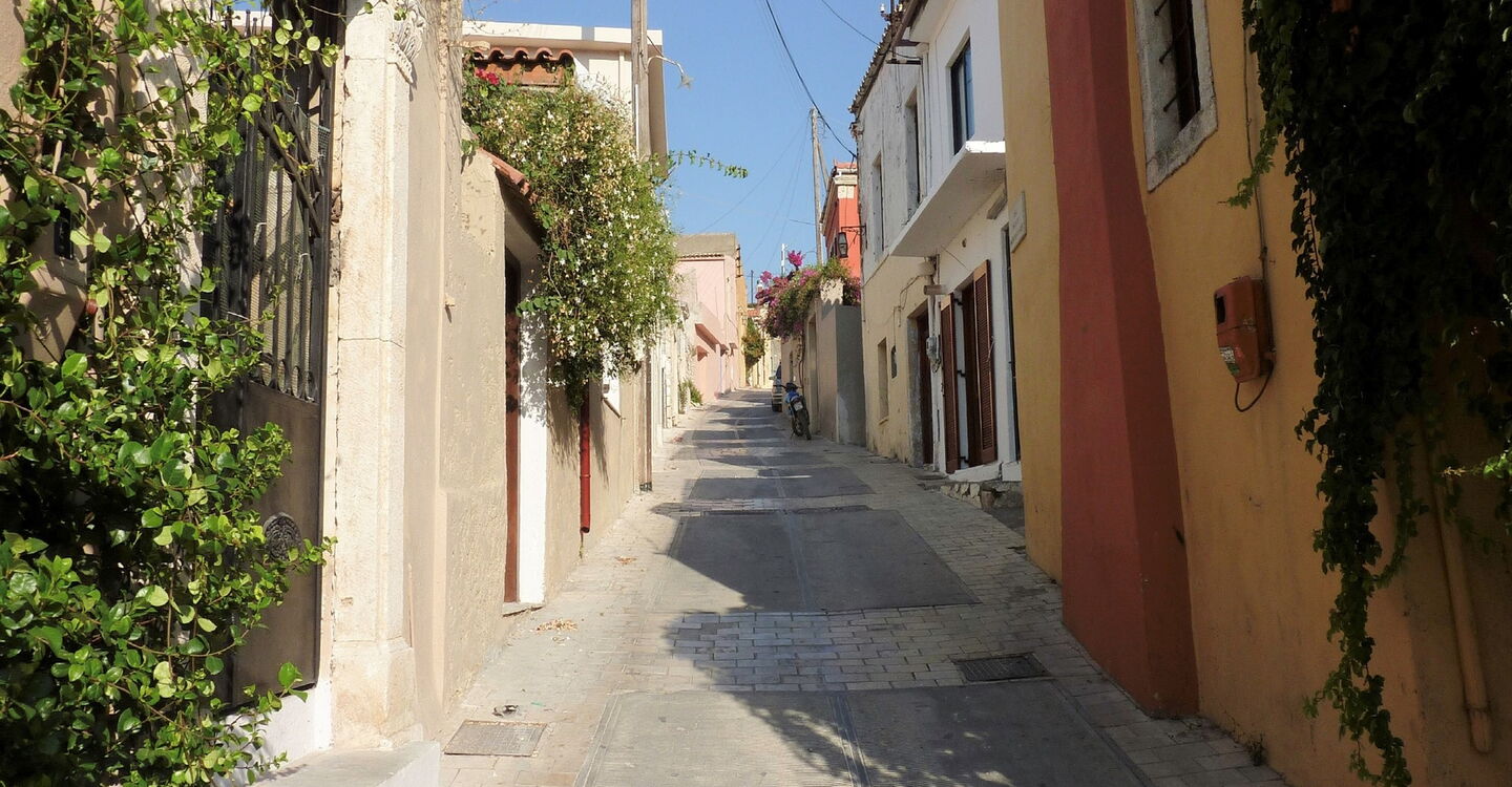 Auf Ziegenpfaden steigen wir durch dichtes Buschwerk in die 03 Schlucht von Astraki (170 m) hinunter. Wir gehen jetzt 1,2 km durch diese Schlucht, zuerst noch unwegsam, aber schon bald treffen wir auf E4-Markierungen und einen Pfad. Wir erreichen eine 2. Schlucht, aber bitte nicht in die Schlucht links herein wandern, sondern den weiß-roten Markierungen bis zu einer Steinbrücke aus der Schlucht heraus folgen. Wir gehen auf der bergauf führenden Piste bis zum Ende. Weiter geht es rechts bergauf, bis der Weg bei einem Strommast und einer Ruine endet. Wir gehen 50 m rechts, um bei der Kirche sofort wieder links abzubiegen. Unser Weg mündet in eine Asphaltstraße und endet an einer Hauptstraße. Dort am Platz gehen wir rechts und sofort wieder links, um dann bei der folgenden Kirche, auf die wir zugehen, rechts weiter durch den Ort Myrtia zu spazieren. Nach 70 m erreichen wir das Nikos-Kazantzakis-Museum.
