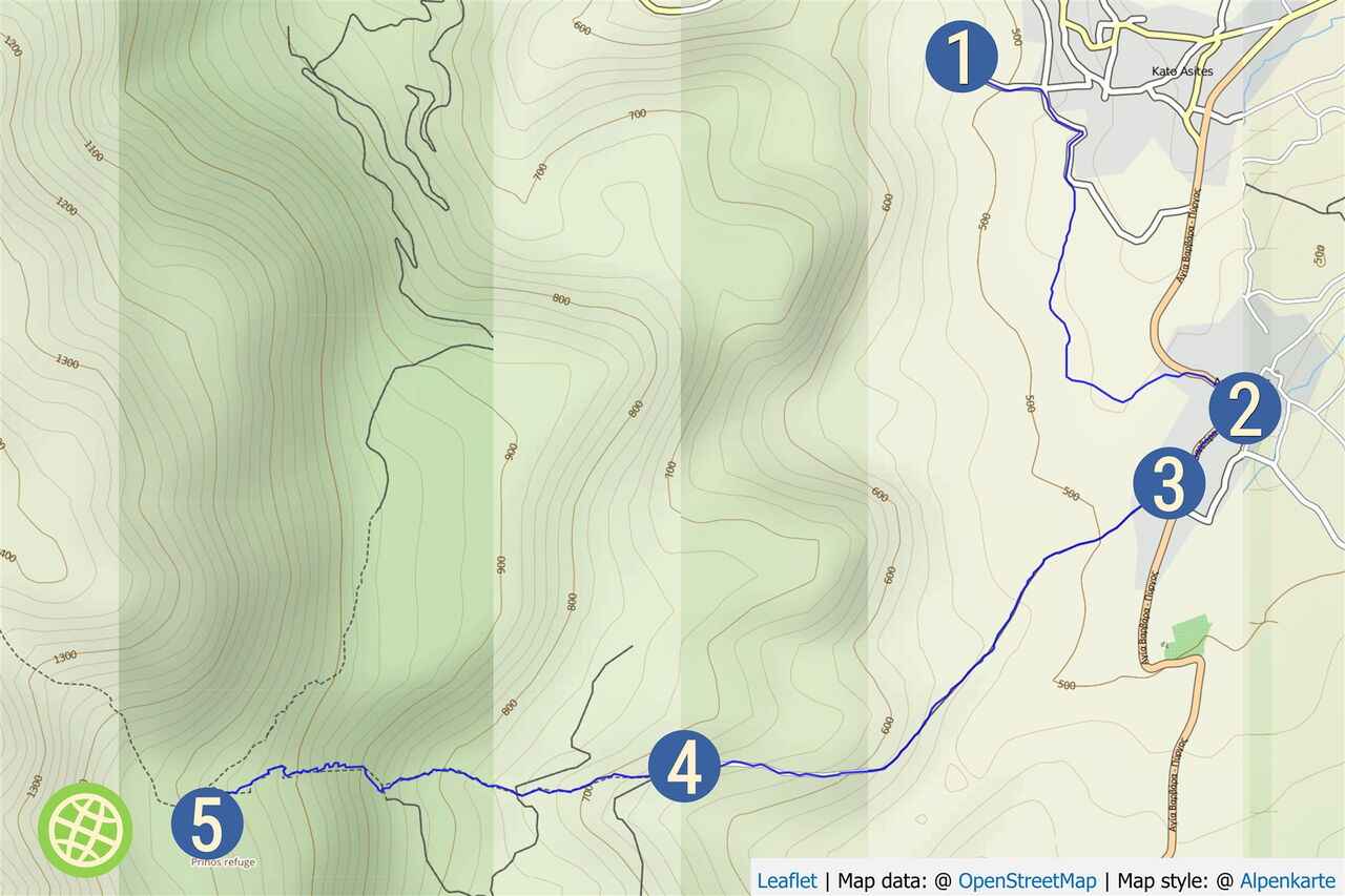 Von der Unterkunft in 01 Kato Asites (552 m) gehen wir auf der bergab führenden Asphaltstraße bei der ersten Möglichkeit rechts und anschließend halb rechts – direkt hinter der Kirche – weiter auf einer betonierten Piste. Dort, wo diese Piste eine Rechtskehre macht, gehen wir geradeaus auf der Schotterpiste weiter.