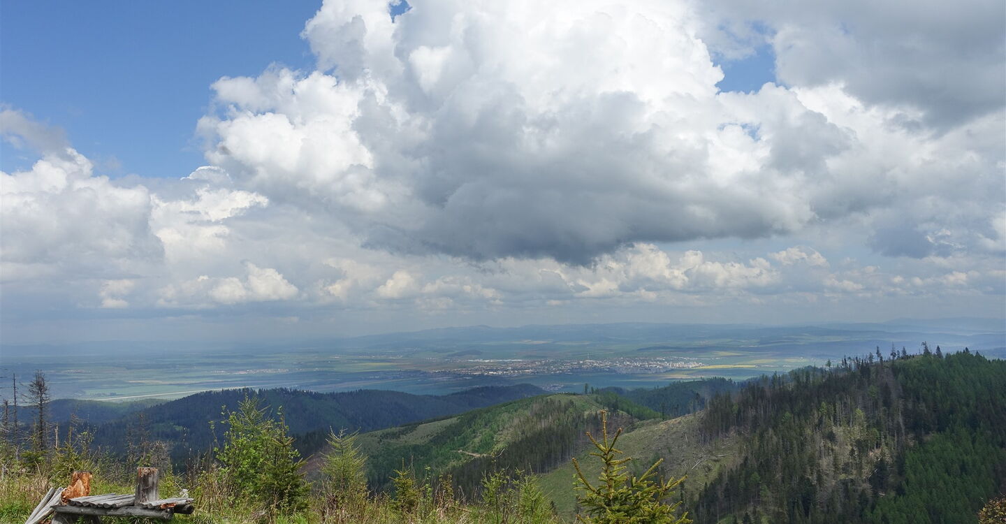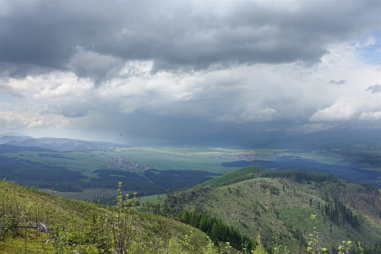 Leicht bergab traversieren wir über einen Berghang bis zu einem rechten Abzweiger und folgen dort dem blau ausgewiesenen Pfad. Bei der nachfolgenden Einsattelung orientieren wir uns an der Weggabelung halb links und erreichen schlussendlich den Gipfel des 04 Kozí kameň (1255 m). Richtung Norden schaut man auf die Westliche und die Hohe Tatra, Richtung Nordosten erkennt man die Stadt Poprad und Richtung Süden sieht man die östliche Region der Niederen Tatra. Wir überschreiten den Gipfel und marschieren nun auf dem weiterführenden Pfad bergab.