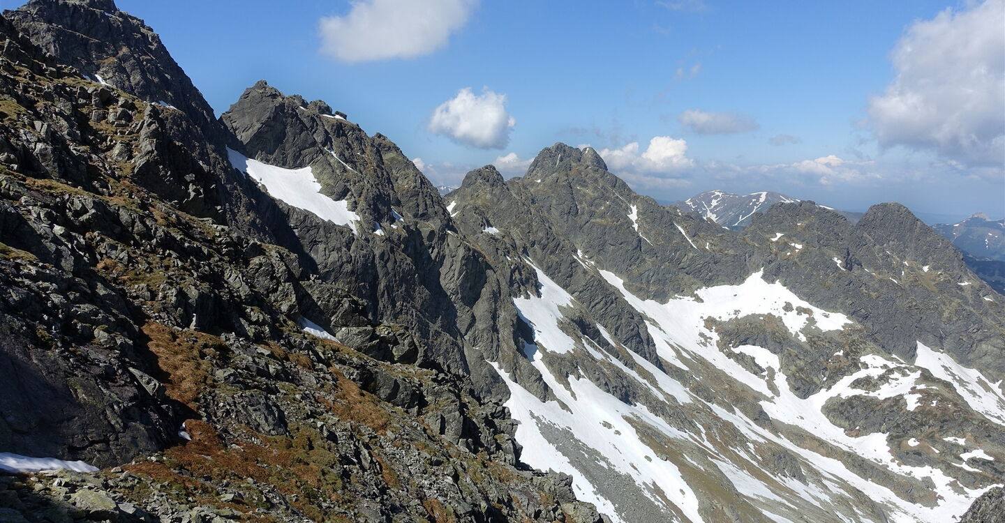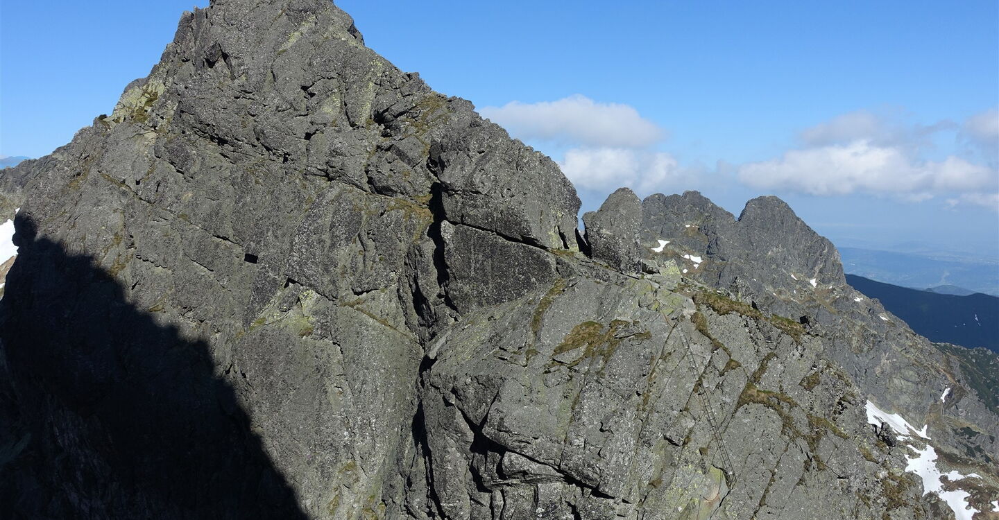 Notabstieg: Hinter der Einsattelung Przełączka nad Dolinką Buczynową führt links ein schwarzer Abstieg zur Hütte Schronisko PTTK Murowaniec. Nach 25 Minuten führt links ein grüner Steig bergab, auch dieser führt zur Hütte Schronisko PTTK Murowaniec. Weiter auf dem Höhenweg: Es erfolgt ein längerer Abstieg unterhalb des nördlichen Bergkamms, um dann rechts steil durch einen spektakulären Kamin aufzusteigen, den Komin pod Czarnym Mniszkiem. Wir erreichen den markanten Gipfel des 04 Skrajny Granat (2225 m). Hier beginnt dann ein luftiges Kletterabenteuer mit vielen ausgesetzten Passagen, Kettensicherungen und Eisenleitern. Der Klettersteig ist vorgegeben und bedarf keiner weiteren Erklärung. In den schattigen Lagen liegt noch bis Mitte Juni Schnee!