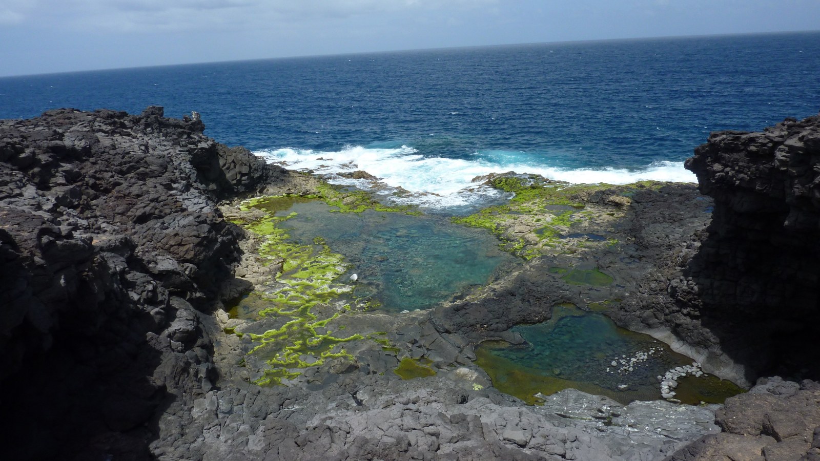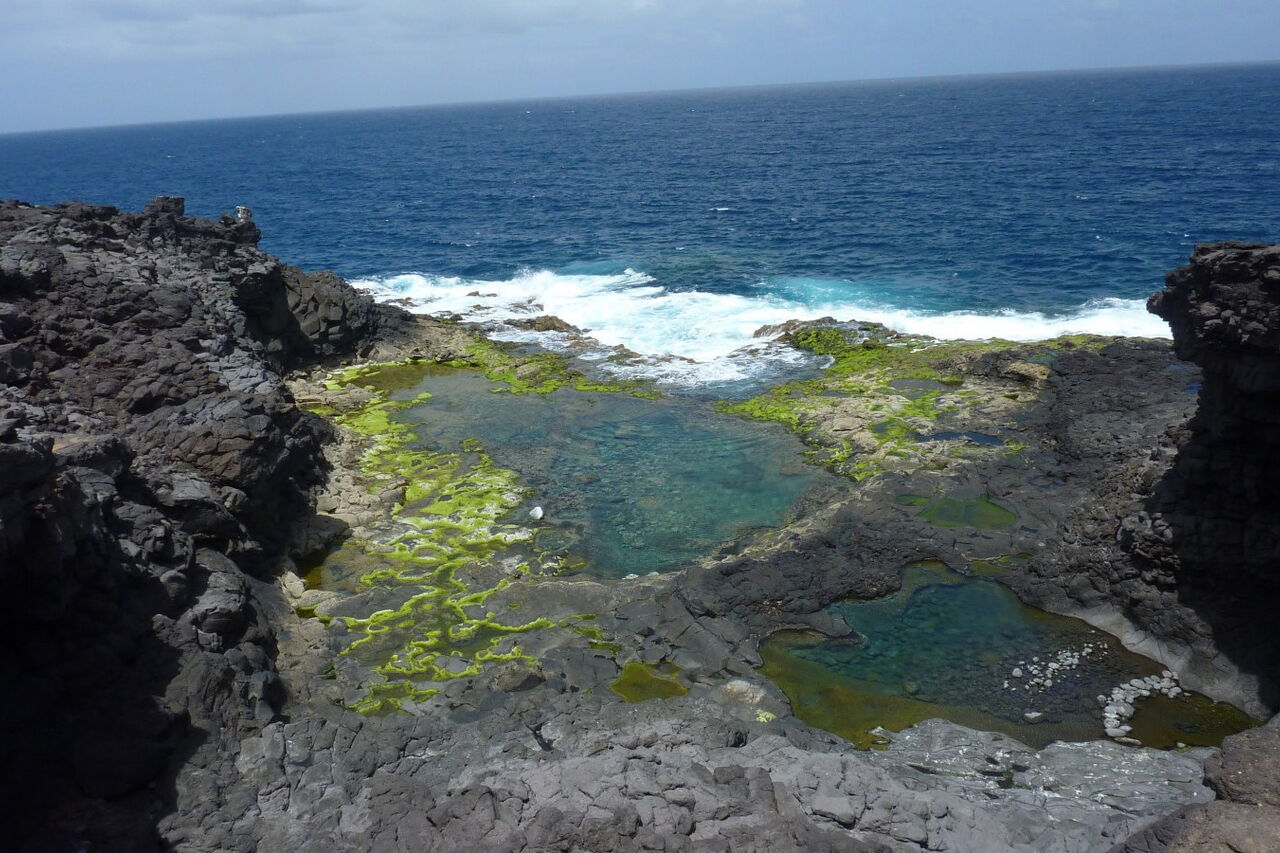 Wir gehen durch den Haupteingang der Bauruine bis zum Meer vor. Schauen wir über die Klippe, so sehen wir wundervolle versteckte Badeplätze. Diese sogenannten Charcos - (04) Naturschwimmbecken (26 m) - laden zum Baden an der felsigen Küste ein. Bei Flut oder bei rauer See füllen sich die von der Natur geschaffenen Pools mit Meerwasser, das sich in der Sonne erwärmt. Im weiteren Verlauf Richtung Playa Blanca treffen wir noch auf weitere Pools. Baden kann man hier aber nur bei Ebbe und geringem Wellengang, ansonsten besteht Lebensgefahr aufgrund des starken Wellengangs und der starken Unterströmungen.