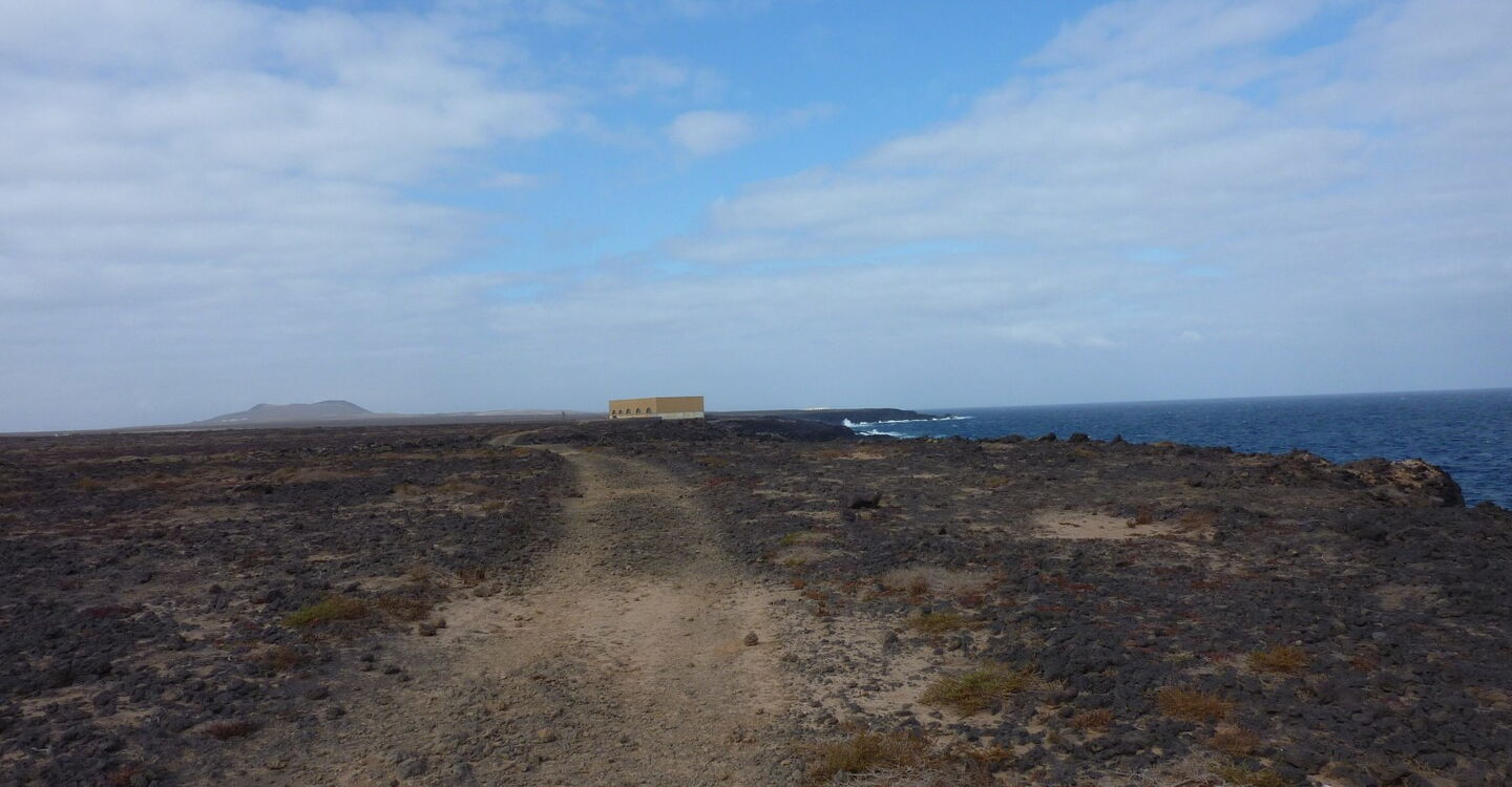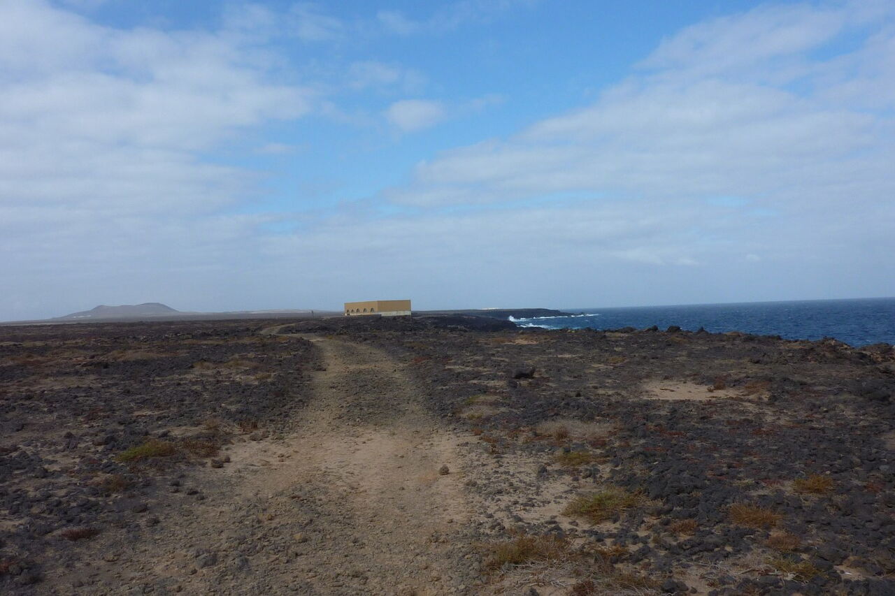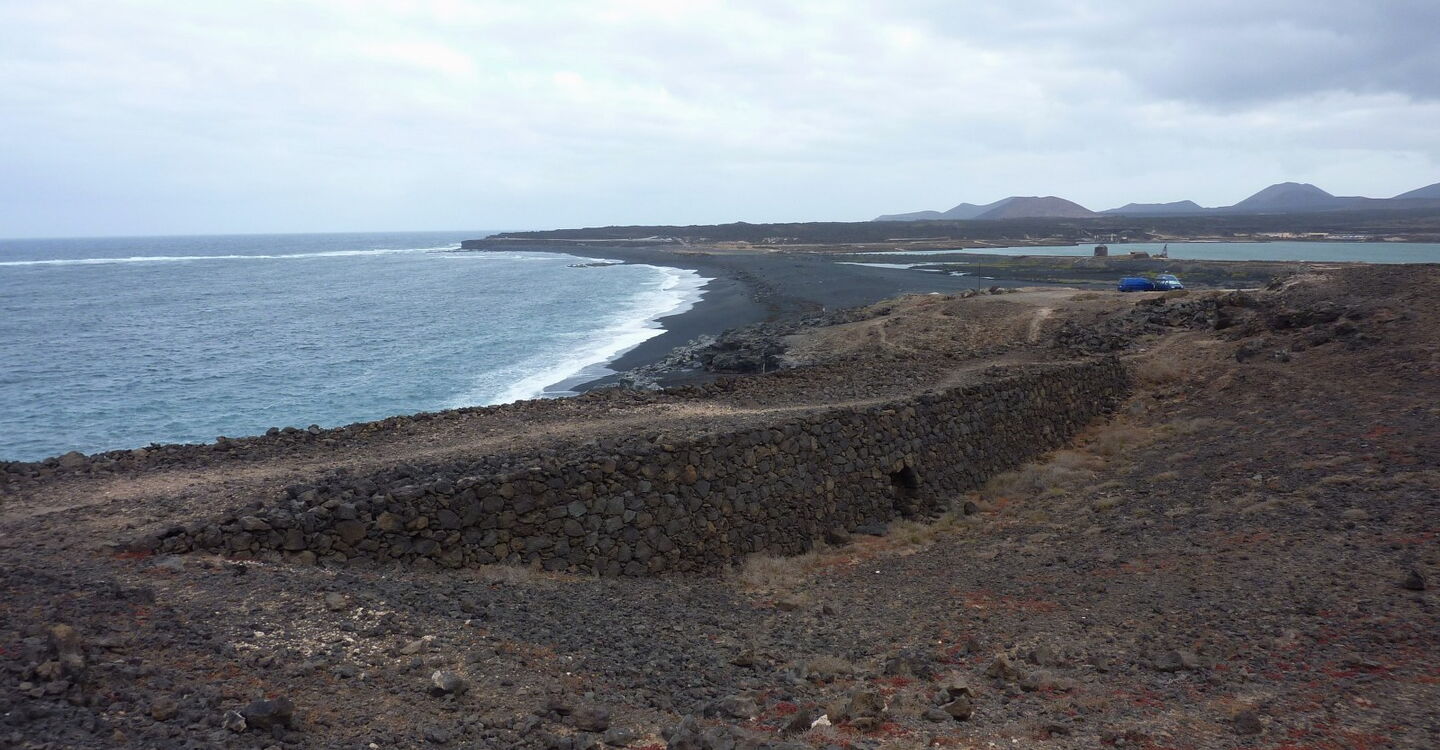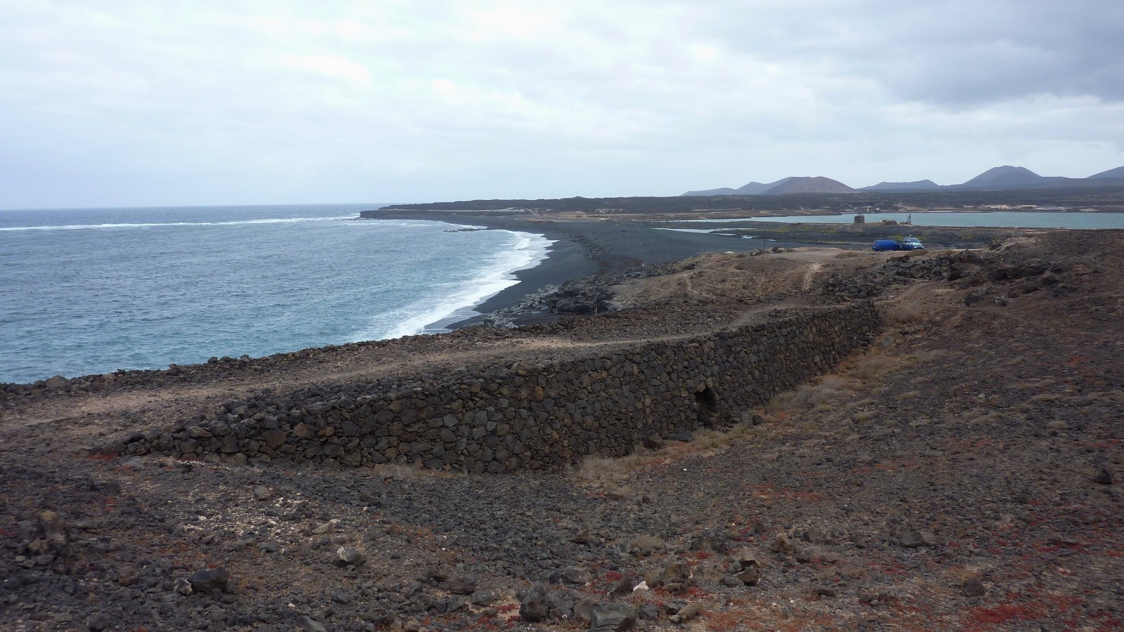 Bei der Palmenallee und der (01) Bushaltestelle (51 m) im Ort La Hoya gehen wir in südwestlicher Richtung gerade durch den kleinen Kreisverkehr, um für 800 m auf der Asphaltstraße zu bleiben. Rechts unterhalb von uns liegen die Salinen. Bei einer Parkmöglichkeit gehen wir halb rechts auf den Pfad, der mit einer 9 auf einem rostigen Pfeiler markiert ist. Wir queren ein Barranco und gehen links an einer Ruine vorbei. Bei der Schotterstraße halten wir uns rechts und gehen nun direkt auf den Playa de Janubio zu, um nach 50 m links auf dem Küstenpfad weiterzuwandern.