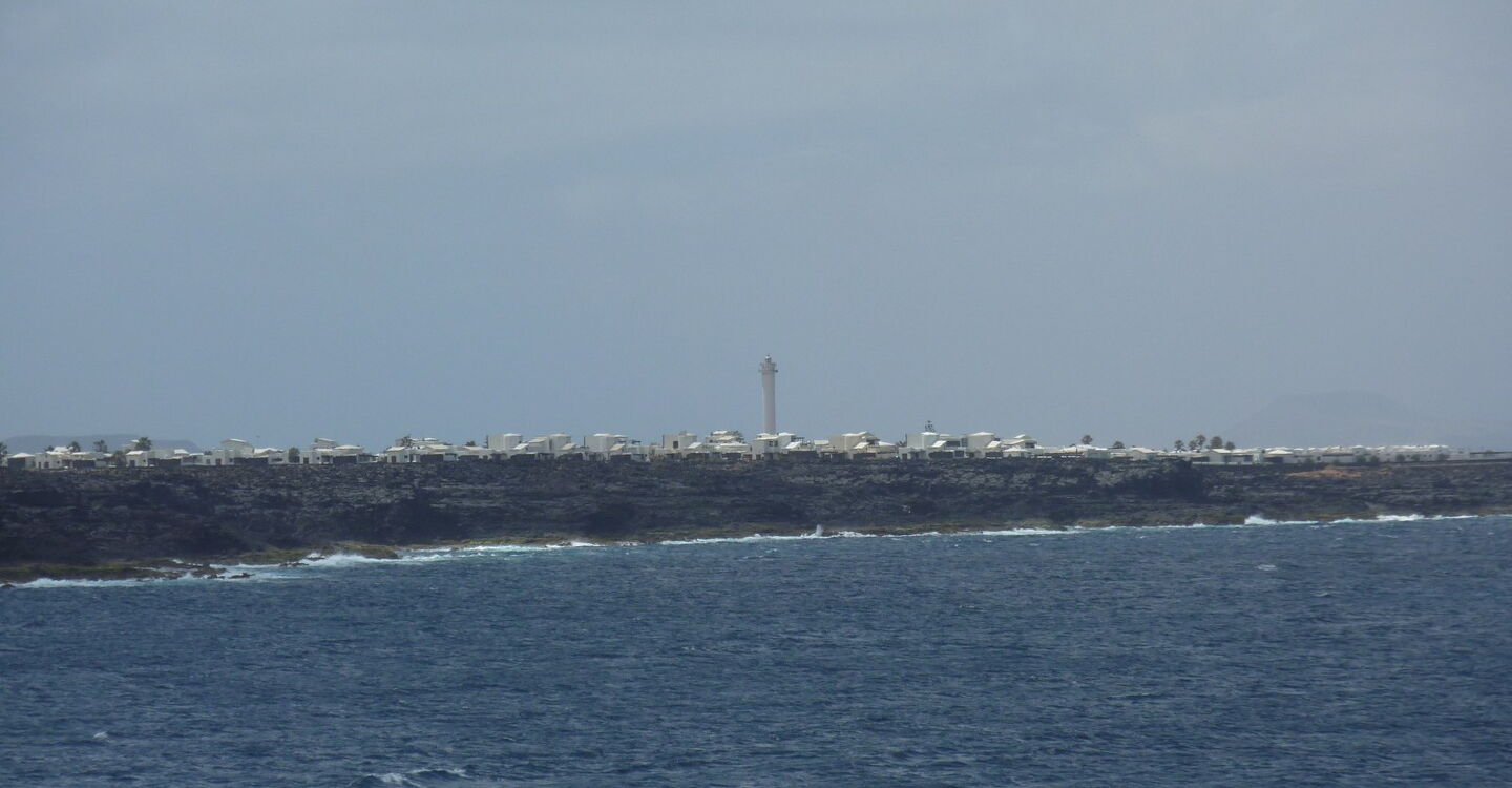 Ab und zu markieren rostige Pfeiler den Weg. Hinter der Punta Guinéa dreht die Richtung des Weges auf Süd. Links liegt nun der Hausvulkan von Playa Blanca, der Montaña Roja, und am Horizont lassen sich bereits der Leuchtturm sowie die vorgelagerten Apartmentanlagen ausmachen. Nach einem Graben gehen wir direkt auf die ersten Häuser zu, um noch weitere 200 m auf der Strandpromenade zu spazieren. Dann biegen wir bei einem Grünstreifen links in die nur kurz später beginnende Calle Irlanda ab, gehen vorbei an einigen Läden und erreichen die (05) Bushaltestelle Faro Park (19 m).