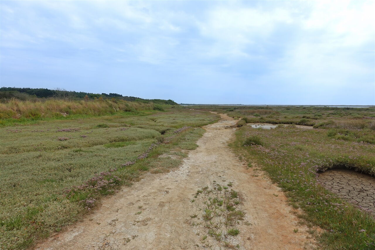 Hinter einer Zufahrtsstraße geht es wieder direkt am Strand entlang. Kurz später laufen wir ein kurzes Stück auf einer Straße. Der Pfad führt nun in einem großen Bogen an einer Bucht entlang, direkt auf eine Kirche zu. Auf einem markierten Wegstück erreichen wir über extrem schmale Gassen – teilweise muss man den Rucksack abnehmen, um überhaupt hindurchzukommen – die Straße, an der wir rechts gehen, sodass wir an der 02 Église Sainte Radegonde (2 m) vorbeikommen. Direkt hinter dem Damm gehen wir rechts. Bei der darauffolgenden Weggabelung gehen wir nicht halb rechts zum Meeres- und Naturmuseum La Maison de l'Ile Kerner, das auf der Halbinsel in der Lagune liegt, sondern halb links, um nach 250 m hinter der kleinen Grünanlage nach rechts abzubiegen. Dieses Wegstück ist auch ausgeschildert. Nachdem der Weg einmal seine Richtung nach rechts und dann nach links geändert hat, gehen wir wieder parallel zu den Marschwiesen in der Lagune. Der weitere Weg: Es geht vorbei an einem Parkplatz mit Picknicktischen, einen linken Abzweiger nach Le Dreff ignorieren wir. Der Pfad führt direkt über die Marschwiesen und es geht über einen künstlich angelegten Damm.