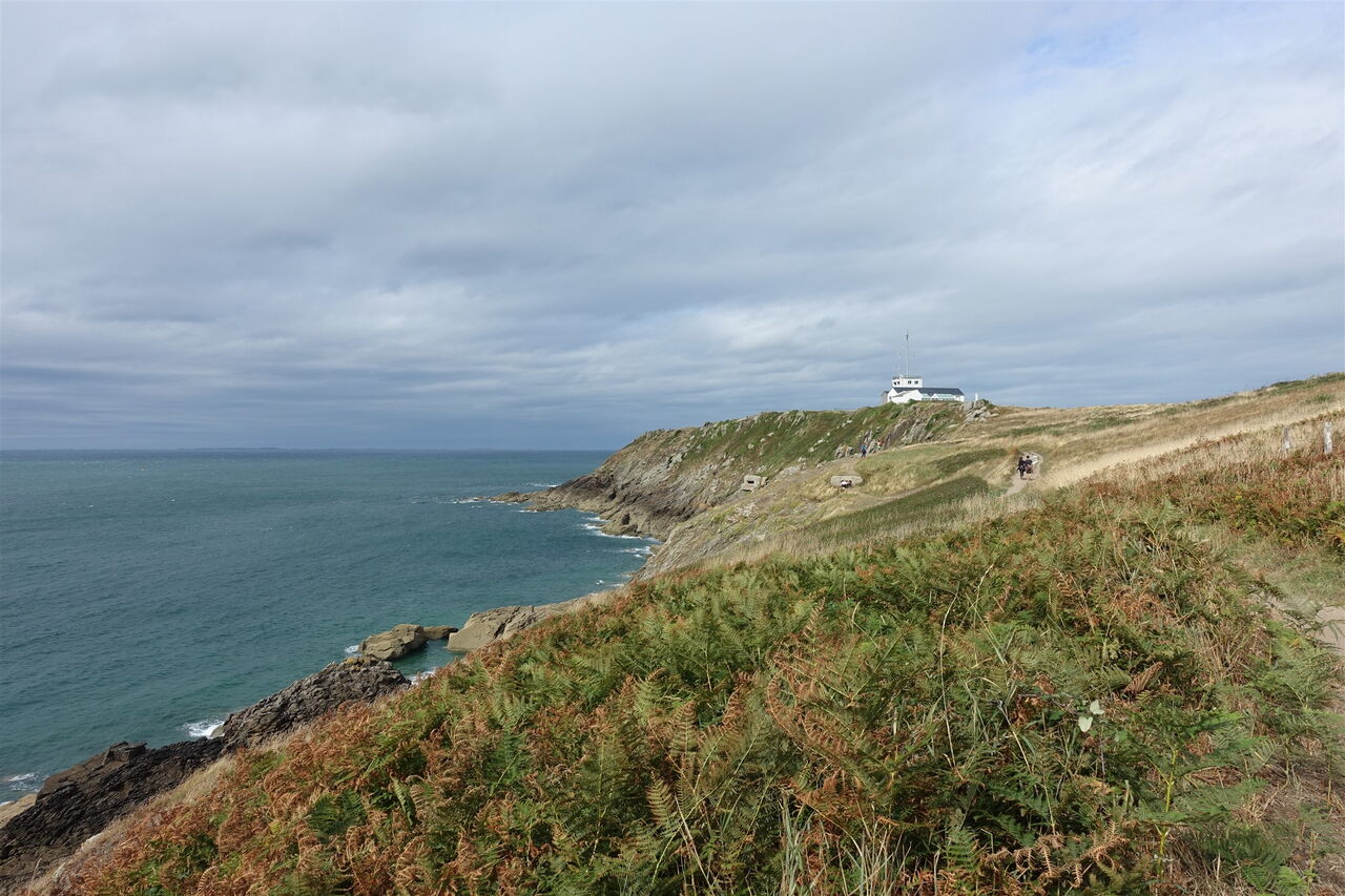 Sobald wir uns auf dem Wirrwarr zahlreicher Pfade der Landspitze 03 La Pointe du Grouin (34 m) nähern, treffen wir auf viele Besucher, da man mit dem Pkw und Bus bis weit auf die Landspitze fahren kann. Von der Landspitze eröffnet sich ein atemberaubender Panoramablick in östliche Richtung über die Bucht bis zum 25 km entfernten Mont-Saint-Michel, der wie ein riesiger Brandungsfelsen aus dem Meer heraussticht. Mit etwas Glück kann man Delfine ausmachen. Direkt am Anfang des Parkplatzes zweigt nach halb rechts der weiterführende Wanderweg ab.