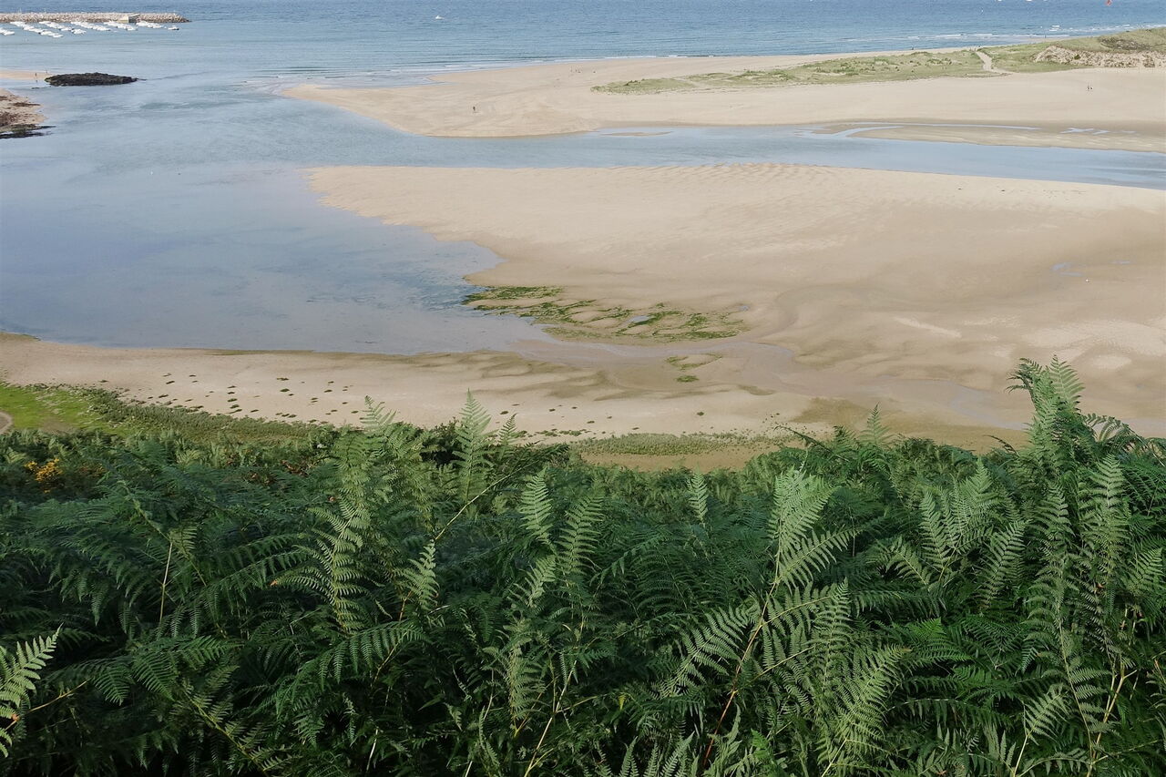 Auf der Straße gehen wir ein kurzes Stück des Hinwegs zurück und dann weiter geradeaus bis zum Ende der Straße – hier befindet sich ein riesiger Feigenbaum unter einer mächtigen Pinie. Wir gehen links an der Mauer entlang und folgen dem Zöllnerpfad. Dieser mündet in die Kehre einer Straße. Wir gehen halb rechts und in der nachfolgenden scharfen Rechtskurve der Straße gehen wir geradeaus auf dem GR34 weiter. Bei einer Hafenmole erreichen wir das nördliche Ende der Halbinsel, rechts befinden sich die große Bucht 03 La Lieue de Gréve (13 m) und ein kleiner windgeschützter Hafen, links der Plage de Beg Douar.