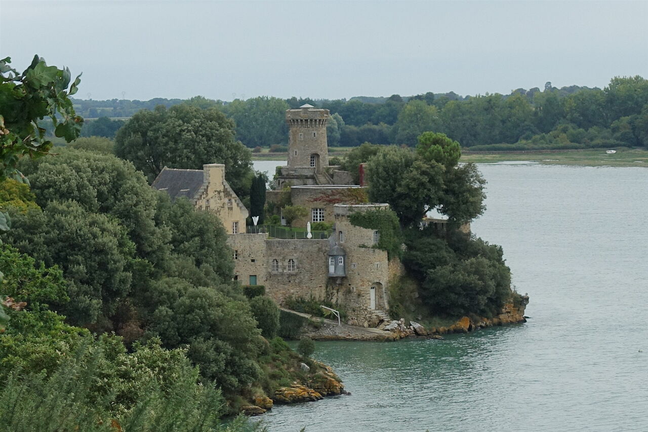 Wir überqueren eine Straße und gehen dort geradeaus an einer Reithalle vorbei. Der Weg mündet in eine rechts abzweigende Grundstückseinfahrt und wir gehen direkt auf ein Haus zu, bei dem wir rechts auf dem weiterführenden Pfad weiterwandern. Im Waldstück erreichen wir eine Weggabelung, rechts befindet ein grünes Gatter. Hier gehen wir rechts leicht bergauf an einem Zaun entlang. Ein rechter Abzweiger wird ignoriert. An der nachfolgenden Weggabelung – von dort kann man eine Hochbrücke ausmachen – gehen wir rechts, bis der Pfad endet. Dort gehen wir dann nicht links, sondern rechts bergauf und nun direkt über das private Anwesen des 02 Le Château de Péhou (30 m). Der Durchgang ist nicht verboten! Der Wanderweg wird durch Ketten begrenzt, Verbotsschilder nach rechts und links weisen auf das Privatgrundstück hin. Wir gelangen an einen Aussichtspunkt, von dem man das Schloss an der Flussmündung der Rance ausmachen kann.