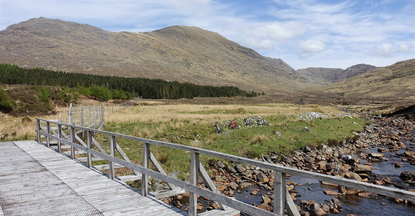 Über einen steilen Abstieg zu der Einsattelung Coire Dhorrcail folgen wir dem Pfad in nordwestliche Richtung. Danach folgt ein steiler Aufstieg, gelegentlich müssen die Hände zu Hilfe genommen werden und es gibt eine Kletterstelle mit dem Schwierigkeitsgrad 2. Hat der Ladhar Bheinn auf seiner südwestlichen Ausrichtung grasbewachsene Hänge, so tut sich unter seinem Gipfelgrat eine steile und zerklüftete Felswand, der sogenannten Coire Dhorrcail auf. Ein nun klar definierter Pfad führt zu dem größtenteils grasbewachsenen Grat hinauf und zum Gipfel des 04 Ladhar Bheinn (1020 m). Es gibt sensationelle Ausblicke entlang des Berggrats bis zu einem Trigonalpunkt, über die Weite des Meeres, zu den Cuillins auf der Insel Skye und rechts hinunter zur Barrisdale Bay und zum Loch Hourn.