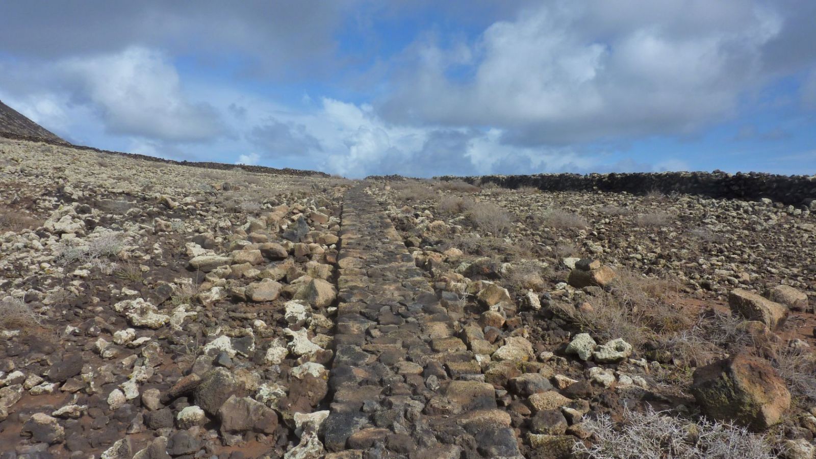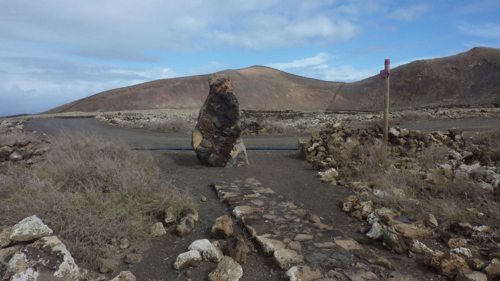 In östliche Richtung führt ein Pfad weg vom vereinzelt stehenden Gebäude, vorbei an brachliegenden Feldern, zu einem markanten aufrecht stehenden Felsen, den man schon aus der Ferne ausmachen kann. Wenn wir an diesem Stein auf der Schotterpiste links gehen, gelangen wir nach Corralejo. Wir gehen aber rechts in (04) Richtung Lajares (189 m). Nach 1,2 km auf der Schotterpiste gehen wir bei der folgenden Weggabelung erneut rechts. Nach weiteren 700 m verlassen wir den Hauptweg und gehen nun halb rechts auf dem Nebenweg weiter.