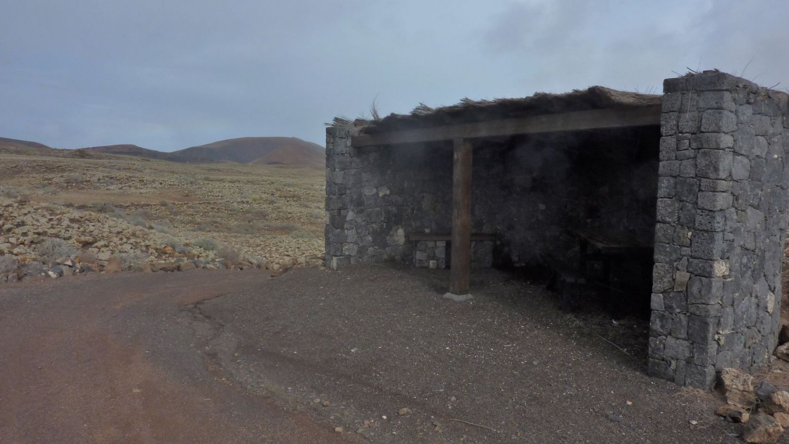 Und wie aus dem Nichts treffen wir nach weiteren 250 m auf ein windgeschütztes (05) Picknickhaus (125 m) – oder eine Unterstellmöglichkeit bei Regen. Was sich die Inselregierung wohl bei der Planung dieser Picknickstelle gedacht hat? Nach weiteren 1,5 km erreichen wir die ersten Häuser von Lajares. 600 m weiter münden von rechts zwei Ausfahrtsstraßen auf den Hauptweg. Nach 400 m auf der zweiten Straße gelangen wir auf der folgenden Asphaltstraße rechts zum Parkplatz.
