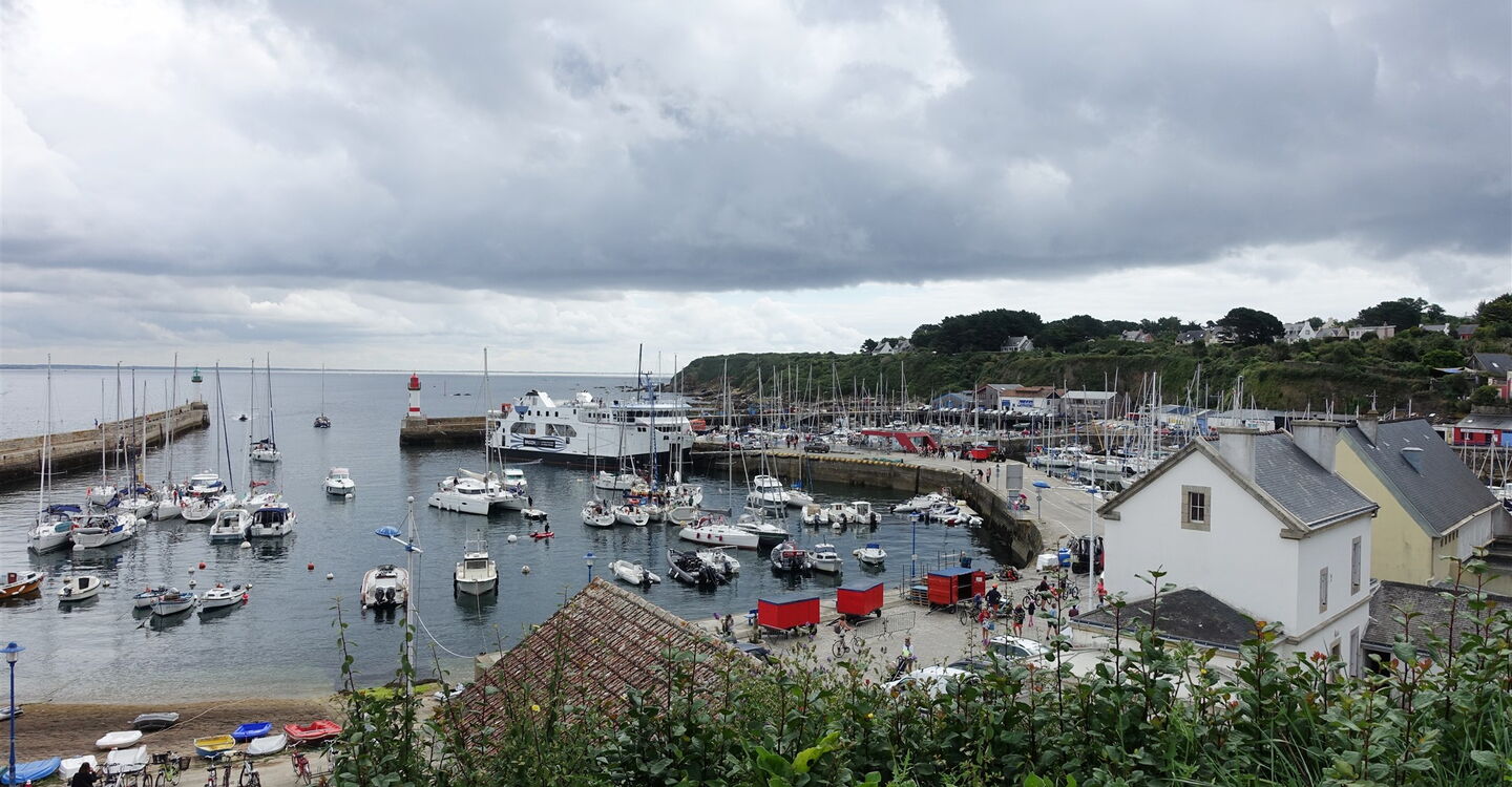 Kurz hinter einem Teich und einer Quelle gehen wir auf der nachfolgenden Straße links, um hinter dem Haus mit den roten Rollläden halb rechts auf die Piste abzuzweigen. Hinter dem Klettergarten endet die Piste und wir gehen links auf der Straße bis zur nächsten Kreuzung nach 250 m vor. Hier gehen wir rechts und erreichen die Inselhauptstadt. Durch die Fußgängerzone gehen wir direkt auf die 05 Église Saint Tudy (27 m) zu. Anstatt eines Wetterhahns ziert ein Thunfisch die Spitze des Glockenturms. Er erinnert an die Zeit Anfang des 20. Jahrhunderts, als die Insel der führende Thunfischhafen Frankreichs war. Wir verlassen den Kirchplatz in nördliche Richtung auf der Rue de St. Albin, kommen an einer Lagerhalle vorbei, gehen ein kurzes Stück neben einem Bachlauf her und biegen vor weiteren Lagerhallen links und dann sofort wieder rechts ab. Auf der nachfolgenden Straße gehen wir gerade durch ein kleines Industriegebiet. Dort, wo es links in die Sackgasse geht, gehen wir geradeaus weiter und erreichen einen schönen Aussichtspunkt oberhalb des Hafens.