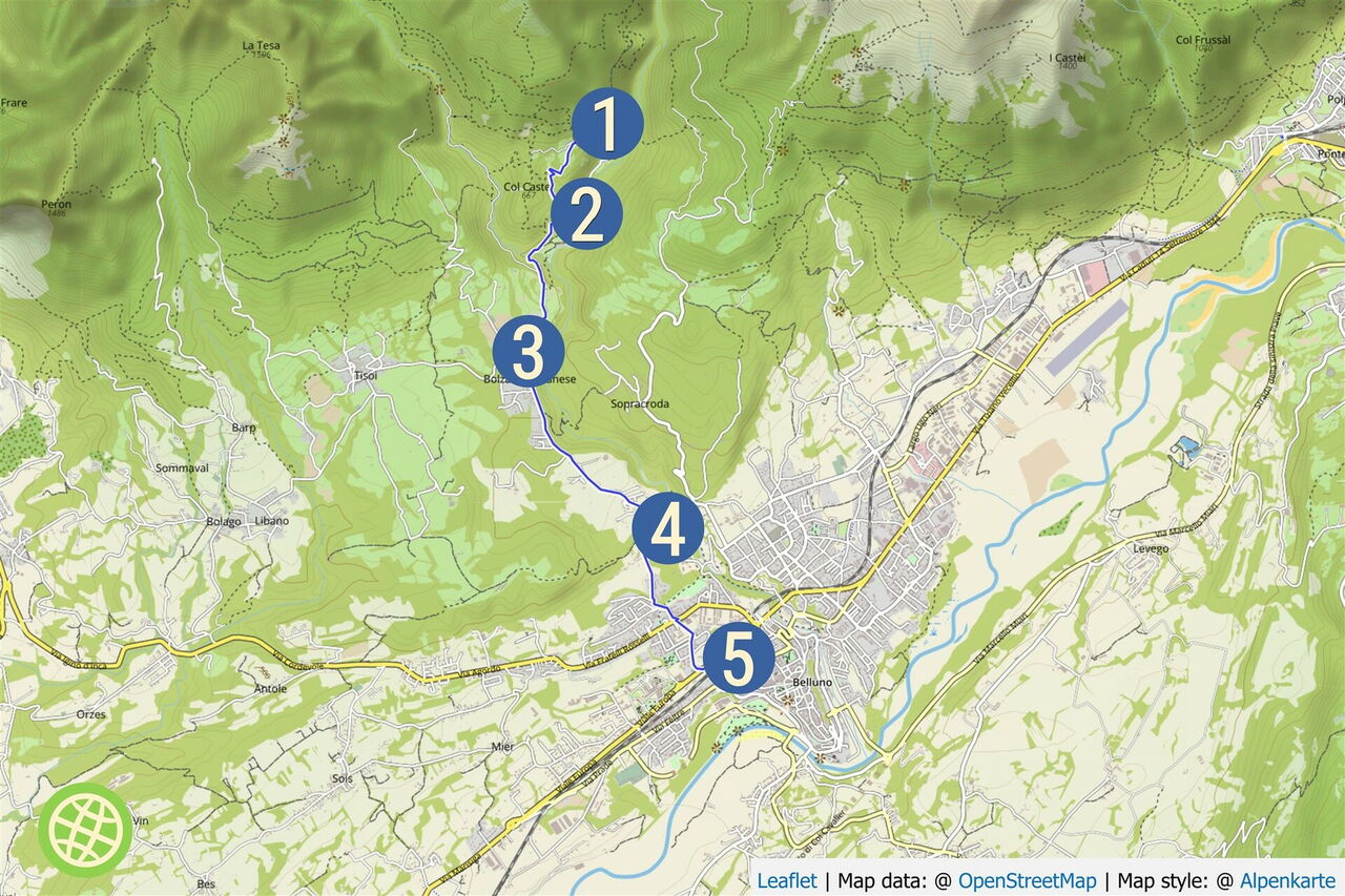 Wie bereits bei anderen Fernwanderwegen erwähnt: Wer einen Fernwanderweg geht, aber dann die letzte Etappe mit dem Bus zurücklegt, handelt ähnlich, als würde man eine Bergtour machen und nicht den Gipfel besteigen. Daher an dieser Stelle ein Plädoyer des Autors, die restlichen 6,5 km bis nach Belluno zu laufen. So starten wir von der 01 Case Bortót (712 m) und gehen zunächst auf der bergab führenden Straße.