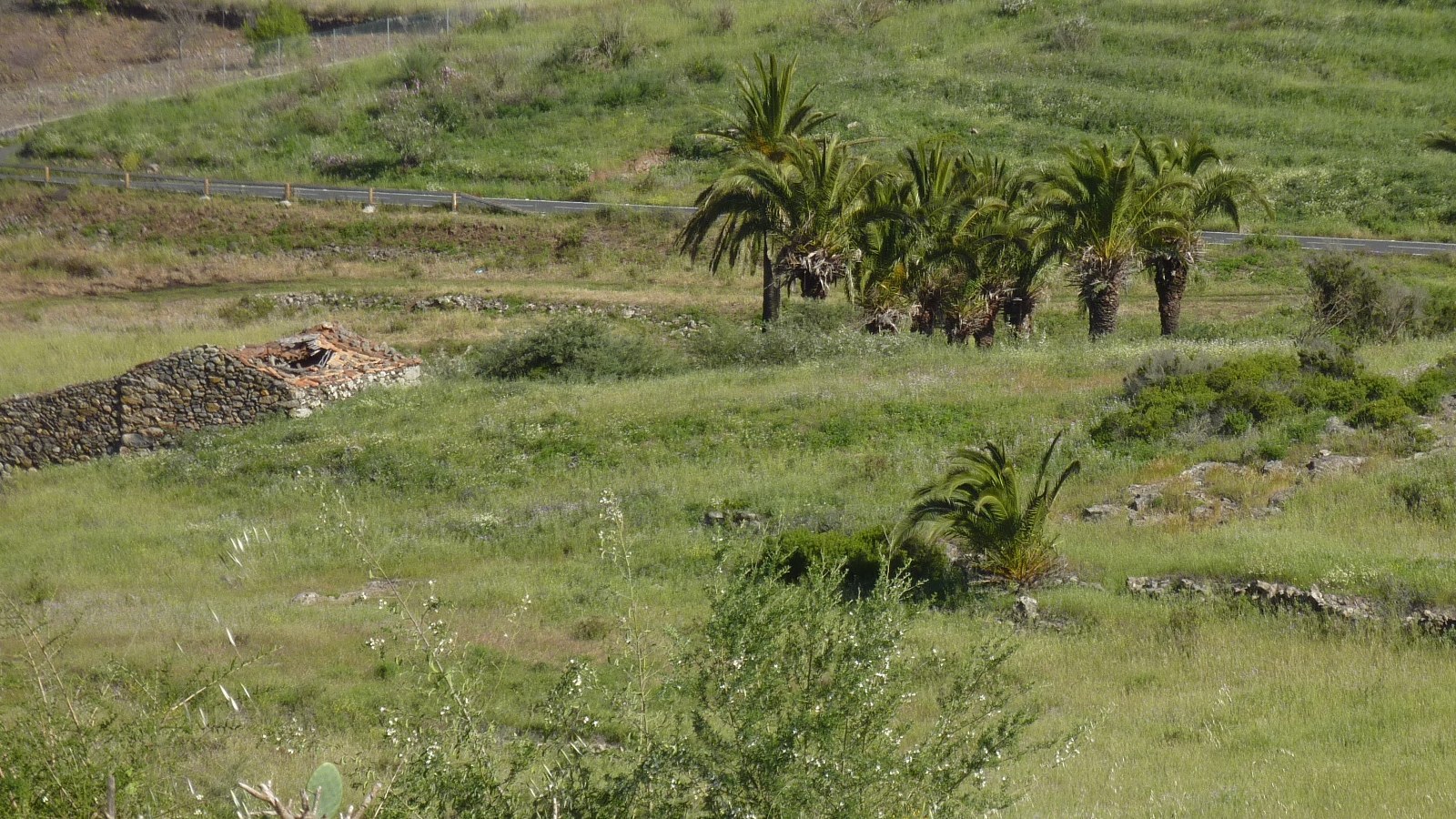 Vom Wirtshaus gehen wir zur Hauptstraße vor, um dann links Richtung Chipude weiterzuwandern. Nach einem kurzen steilen Anstieg treffen wir bei einigen Häusern auf eine (04) Kreuzung (1055 m), über die wir gerade hinübergehen, um nach 20 m dem Abzweiger nach links, Richtung El Cercado, zu folgen. Bereits nach 50 m gabelt sich der Weg und wir gehen rechts, 7,5 km Richtung Valle Gran Rey.