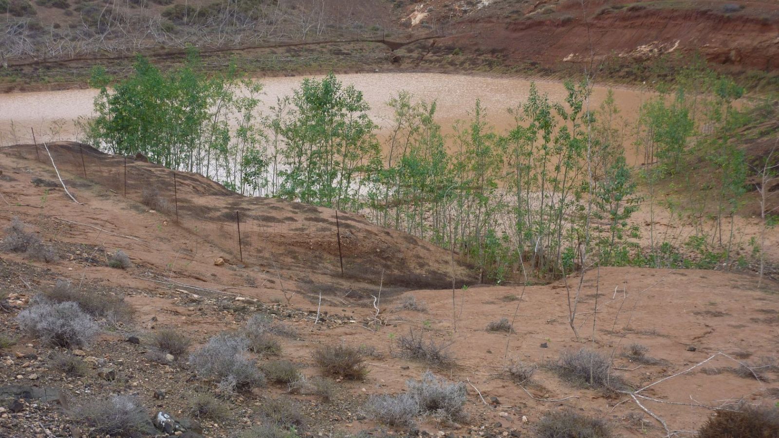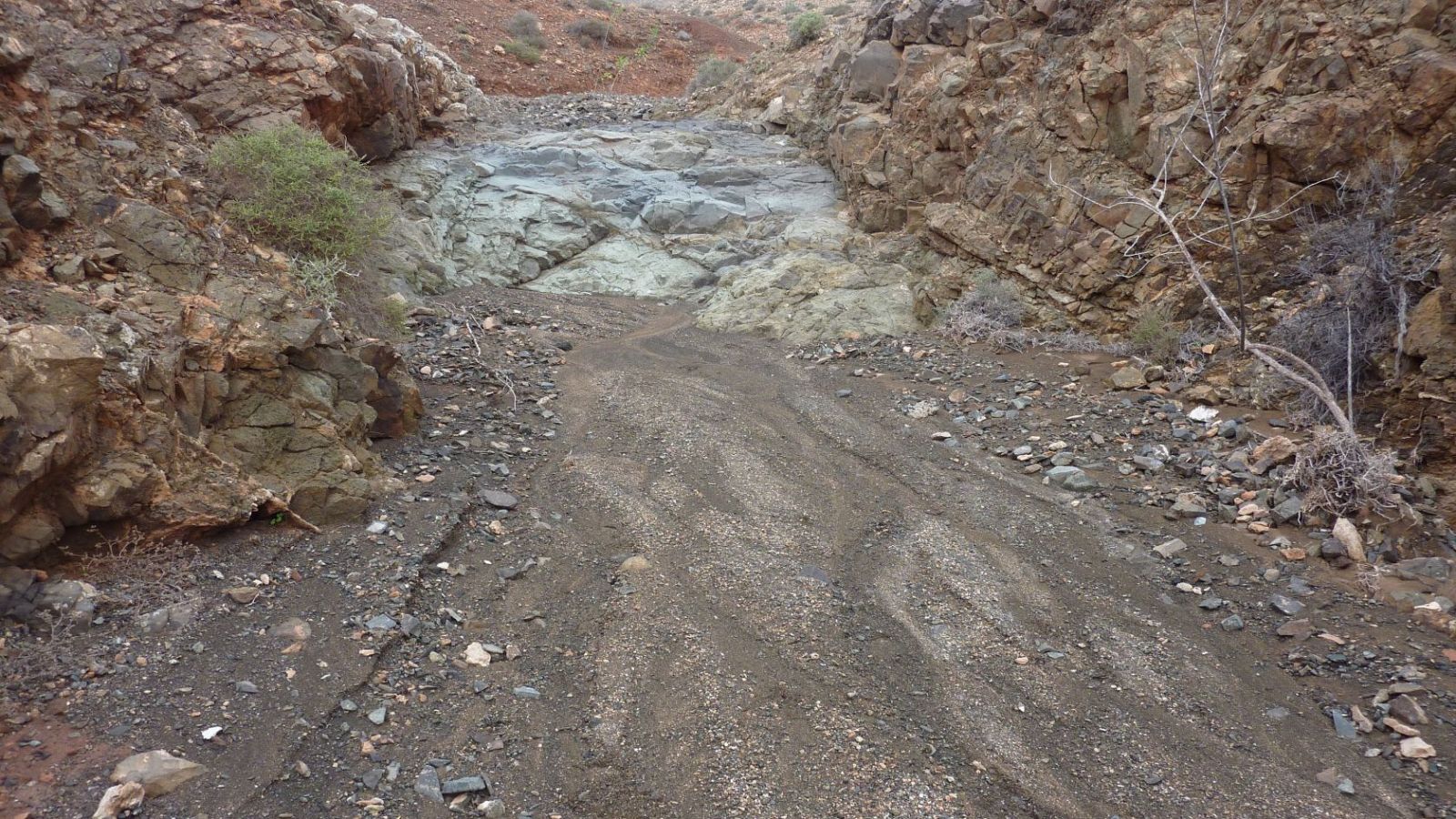 Die ersten paar Meter im Barranco sind noch steinig, aber immer mehr Zuflüsse von rechts und links formen sehr schnell ein breites sandiges Barranco, in dem es nun bequem und leicht bergab weitergeht. Es folgen kleine Wasserfälle, die einfach überwunden werden können – inzwischen ist das Barranco 3 m breit geworden. Wir treffen auf einen markanten Felsen, der quer im Barranco liegt. Nach weiteren 60 m führt von links ein weiteres Barranco in den Hauptstrom. An dieser Stelle, ca. 200 m vor einer künstlich angelegten (04) Staustufe (342 m), verlassen wir das Barranco auf eine zunächst schwer auszumachende Schotterpiste. Sie führt parallel zum nun tiefer liegenden Barranco, direkt zu auf einen künstlich angelegten Staudamm. Nach 130 m und einer langen Linkskehre ändert sich die Wegrichtung auf Nord. Wir gehen nun direkt auf einen weiteren Staudamm zu. Bei der folgenden Weggabelung wandern wir links, bis wir zu einem Barranco gelangen, das den oberen Staudamm nährt.
