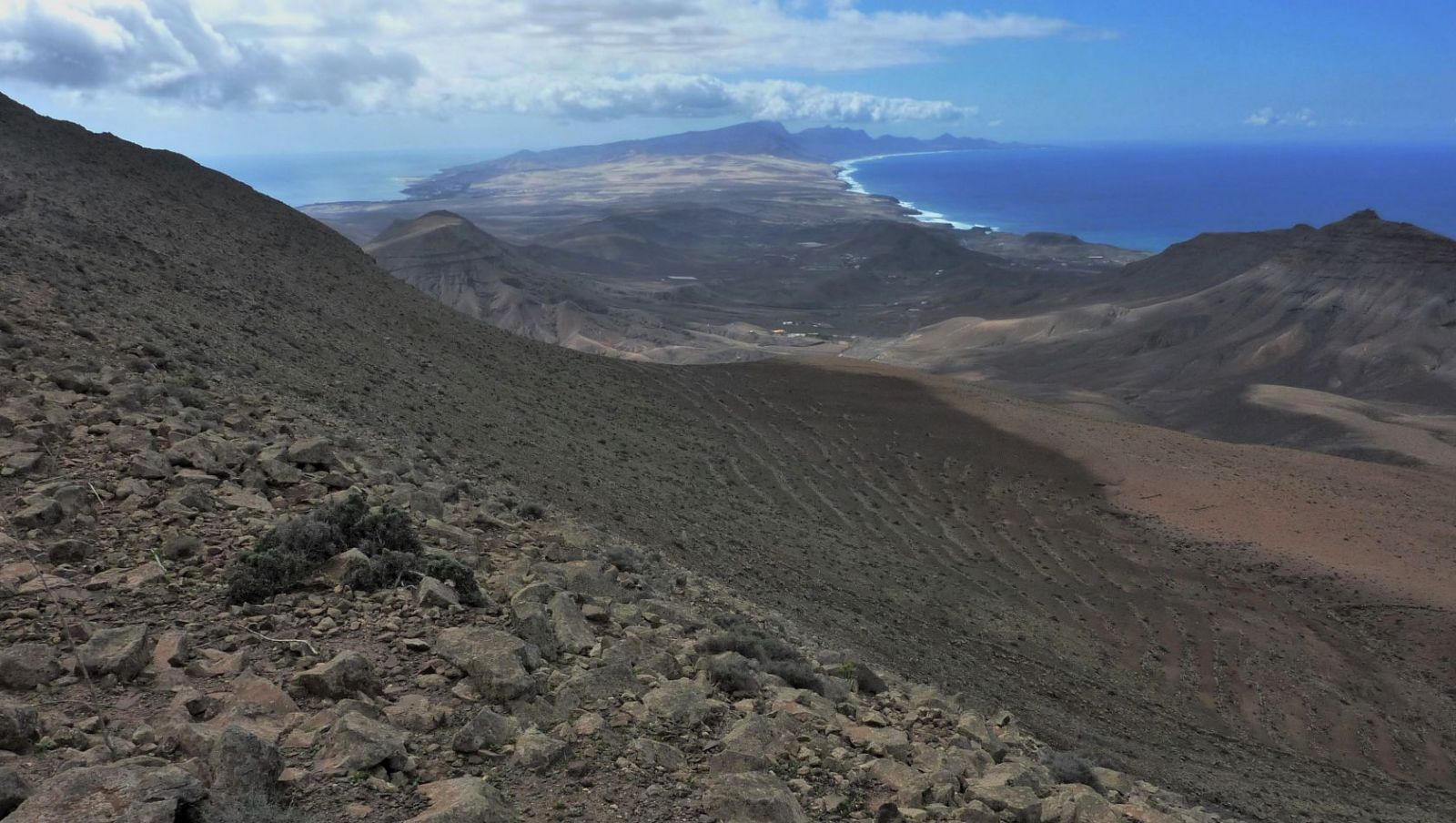 Nach nur 60 Höhenmetern und 410 m Entfernung ist bereits der Mirador (02) Astronomico de Sicasumbre (461 m) erklommen. Am Mirador aufgestellte Ziegenskulpturen des bekannten Bildhauers Juan Miguel Cubas ergeben das perfekte Szenario für ein Urlaubsfoto: im Vordergrund die Ziegen mit Familie und am Horizont die Jandia-Halbinsel mit dem gewaltigen Jandia-Bergmassiv. Am Mirador, direkt neben dem fest installierten Fernrohr und einem kleinen Steinhäufchen, führt auf dem vor uns liegenden Bergrücken ein schmaler Pfad in südliche Richtung talwärts.