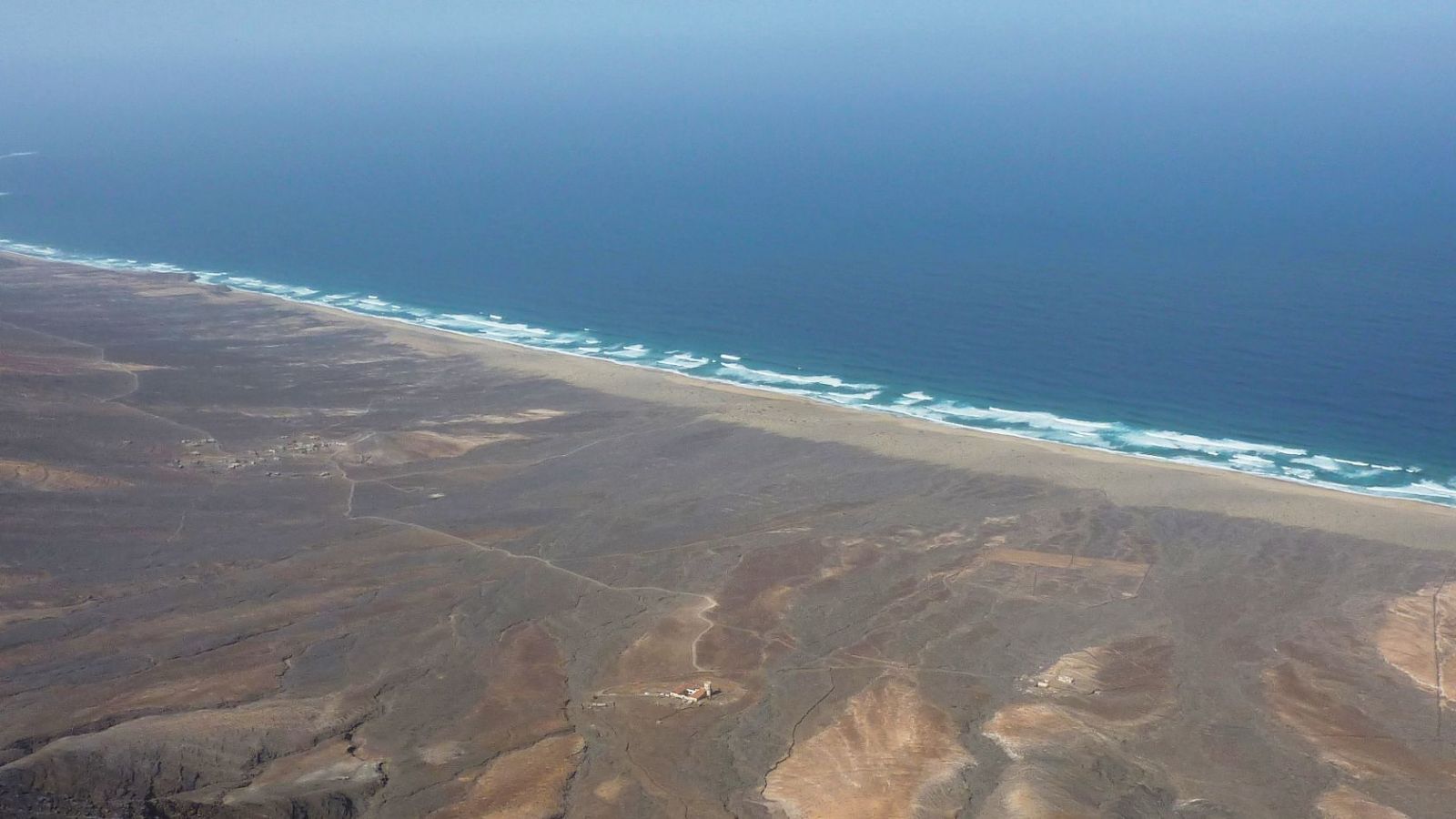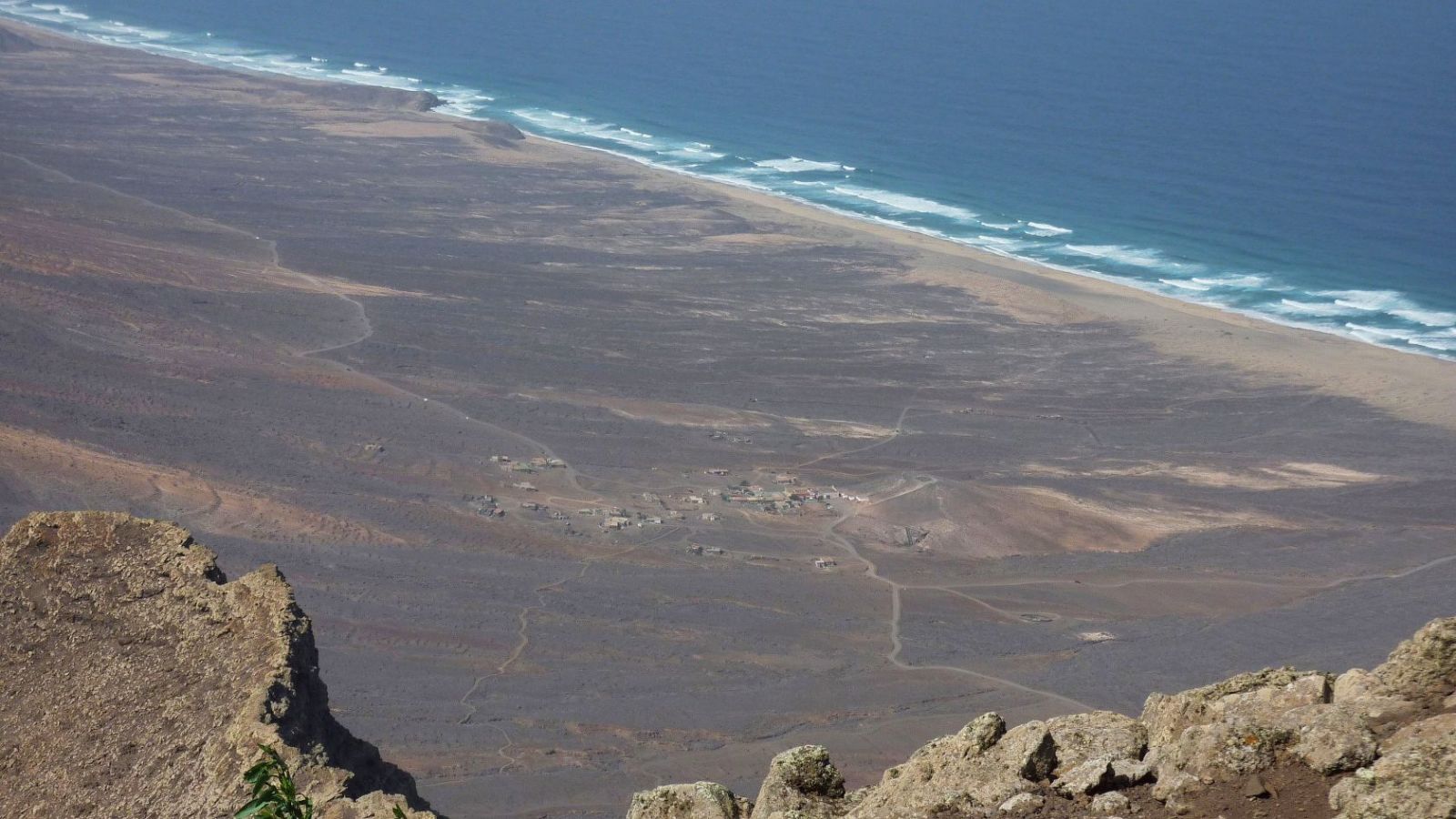 Der Weg wird nun zunehmend steiler und rutschiger, bis wir am Grat angekommen sind und auf den 521 m tiefer gelegenen (03) Playa Cofete (521 m) herunterblicken. Sogar die rätselhafte Villa Winter lässt sich sehr gut ausmachen. Der Deutsche Ingenieur Gustav Winter baute an dieser sehr einsamen und zudem noch schlecht zugänglichen, aber überaus beeindruckenden Stelle von Fuerteventura ein imposantes Haus. Dies geschah genau während des Zweiten Weltkrieges!