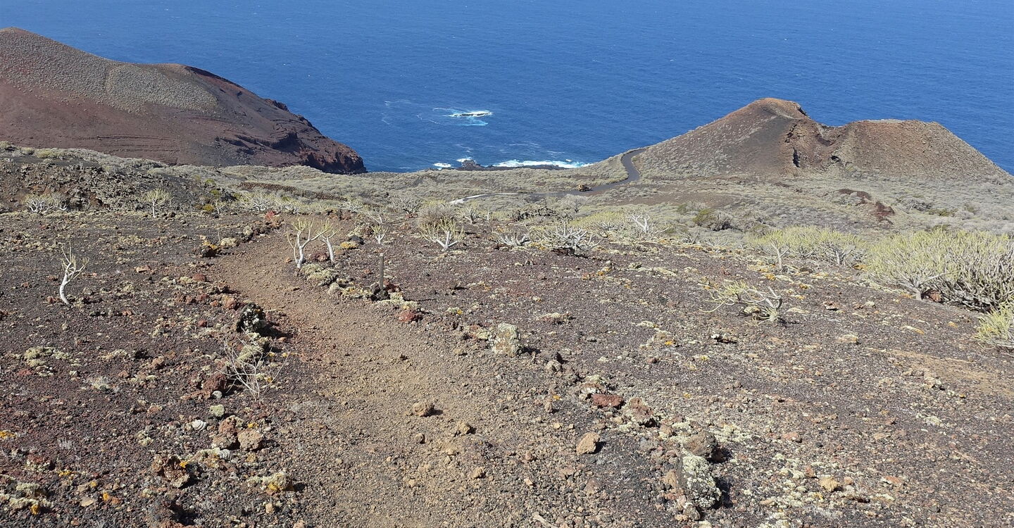 Der Vulkan Lomo Negro, an dem wir uns jetzt befinden, liegt am Ende des Westkammes der vulkanischen Aktivitäten auf El Hierro, in einem Gebiet, das vor etwa 1800 Jahren entstanden ist. Vom Aussichtspunkt kann man sehr schön die Flussrichtung der Lavaströme nachverfolgen: nach rechts Richtung Arco de la Tosca, gerade herunter zum Roque de la Sal und nach links zum Punta del Verdol. Direkt hinter dem (01) Mirador de Lomo Negro 1 (299 m) und der Straße beginnt der angelegte Pfad durch die Vulkanlandschaft zum nächsten Aussichtspunkt.