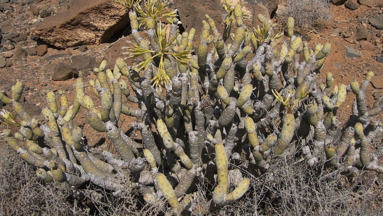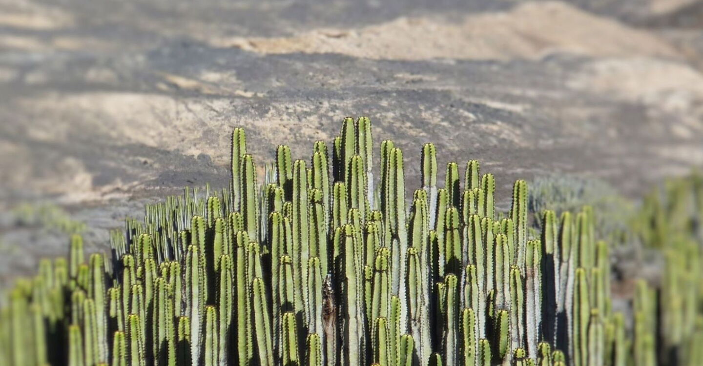 Wir haben jetzt bereits 2,2 km zurückgelegt, das Barranco ist sehr eng und steinig geworden. Sobald wir in dieser kargen Gegend auf Höhe der oberhalb wachsenden Wolfsmilchgewächse angekommen sind, steigen wir nach weiteren 700 m weglos aus dem (03) Barranco (233 m) und wechseln auf die Asphaltstraße. Dieser folgen wir bis zum Ende bei der Degollada de los Canarios. Das erste Etappenziel ist erreicht und wir werden mit einem grandiosen Blick auf die 350 Höhenmeter tiefer liegende Küste belohnt.