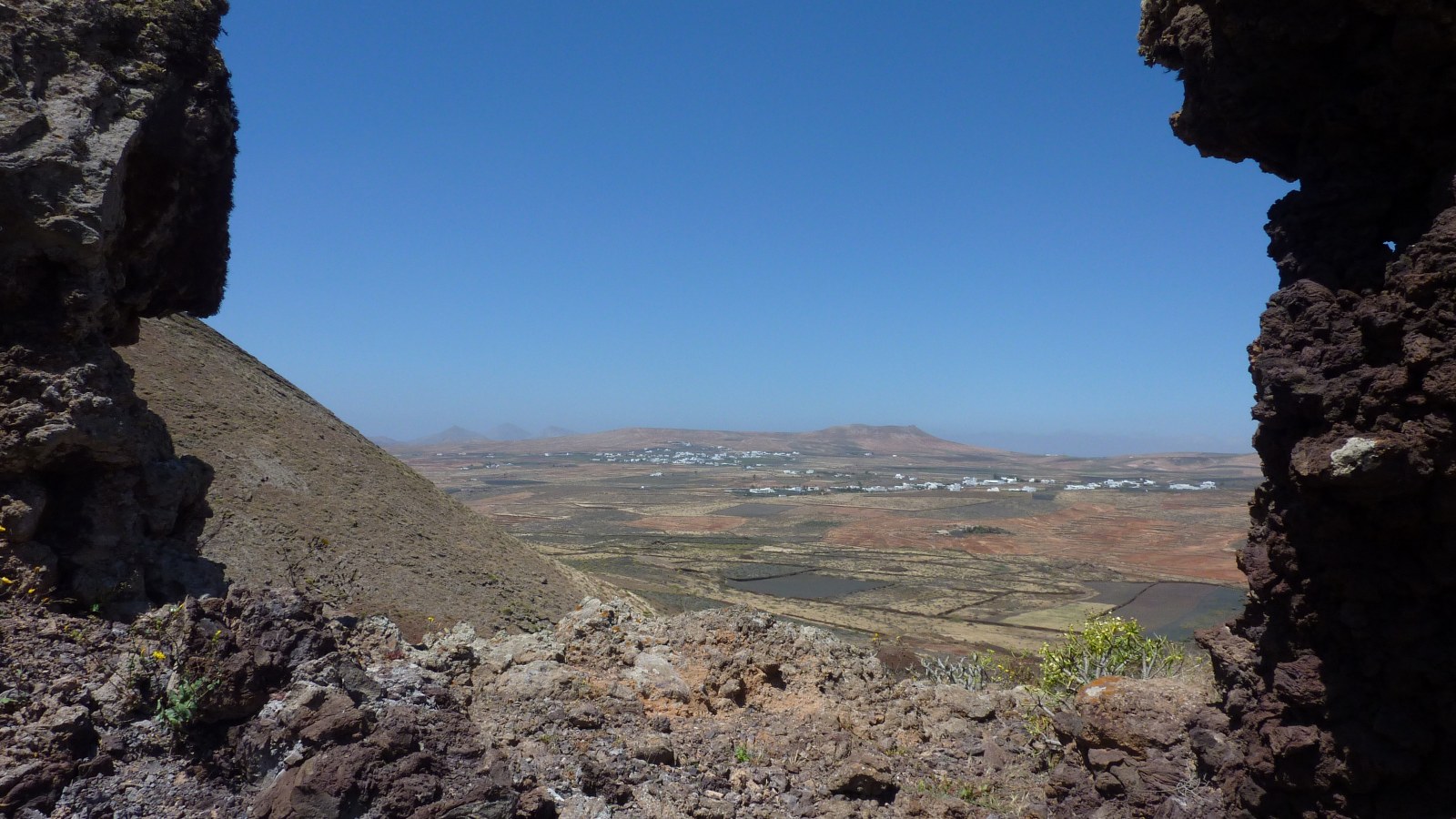 Die Schotterstraße macht eine scharfe Linkskurve und nach 120 m geht es vorbei an der links von uns liegenden Ruine. Noch vor dem Barranco gehen wir rechts und für kurze Zeit weglos auf die nordöstliche Öffnung des Vulkankraters zu. Wenig später ist wieder ein Pfad zu erkennen. Bei einem Durchbruch passieren wir eine Steinmauer. Nachdem wir den Vulkangrund halb rechts durchschritten haben, gehen wir an der hohen Steinmauer entlang. Der Weg ist nicht immer eindeutig ersichtlich. Hinter der Steinmauer beginnt ein Pfad, auf dem wir bis zu einem gut sichtbaren (03) Felsdurchbruch (300 m) aufsteigen.