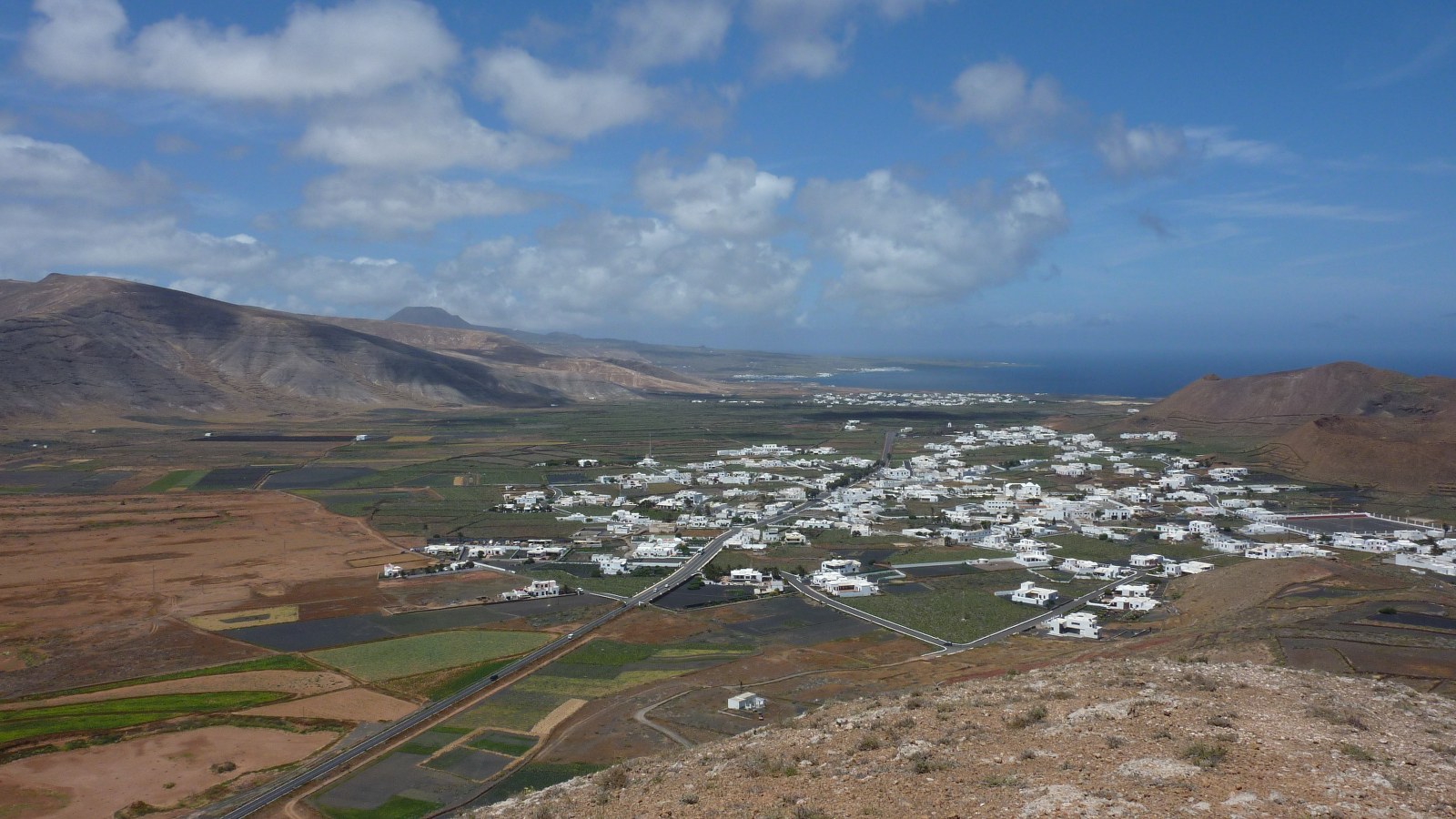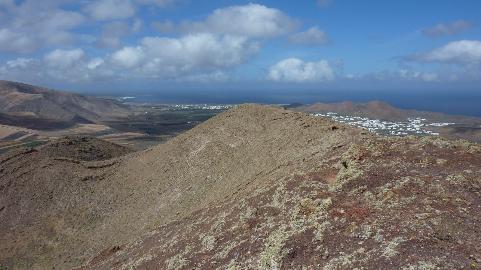 An dieser Stelle verlassen wir den Hauptweg nach rechts in den Hang. Dabei steigen wir links vom Loch, weglos in Kehren, bis auf den Gipfel der (05) Montaña de Guenia (358 m). Im weiteren Verlauf führt der Pfad auf dem Grat entlang, bis wir in den offenen Vulkankessel schauen können. Links auf dem Grat führt ein Weg in den Vulkangrund, aber wir gehen rechts auf dem Grat entlang, um dann steil und weglos abzusteigen. Wir treffen auf eine Schotterpiste und gehen diese links durch ein Barranco. Nach einer Rechtskehre erreichen wir die Asphaltstraße. 250 m später verlässt ein Pfad die Asphaltstraße nach rechts zu einem Gebäude, um anschließend wieder auf die Asphaltstraße zu gelangen. Vorbei geht es am Friedhof, in Kehren bergab, über die LZ-1, um dann zum Start und Ziel in Guatiza zu gelangen.