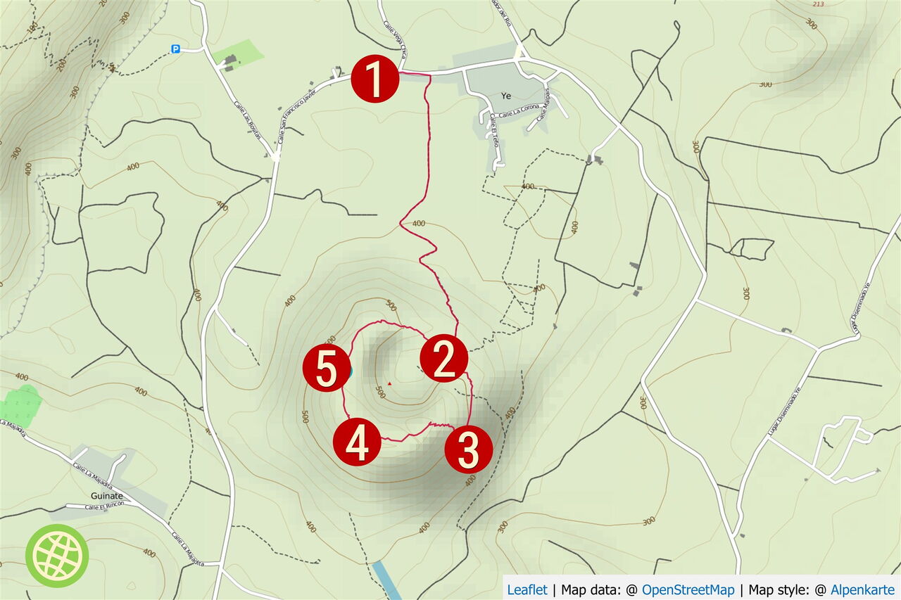 Von der (01) Kirche im Ort Yè (367 m), die dem Schutzheiligen des Dorfes, San Francisco Javier, gewidmet wurde, geht es zunächst 140 m auf der Calle San Francisco Javier in Richtung Osten, um dann rechts in den Wirtschaftsweg zu biegen, der durch zwei Kehren direkt auf den Monte Corona zuführt. Wie überall auf Lanzarote werden auch hier die Weinstöcke mit Steinmauern vor dem Wind geschützt.