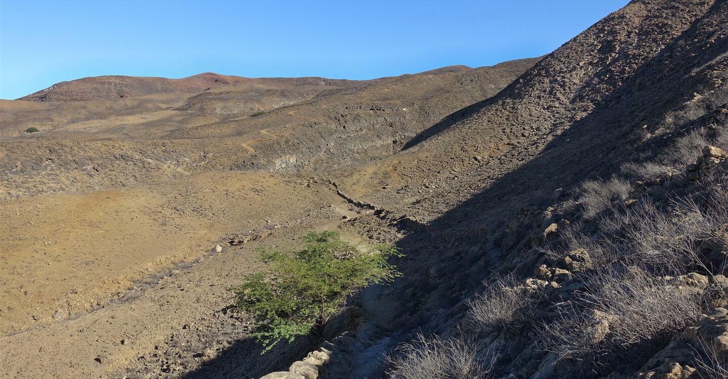 Der zweite Tag der Zweitageswanderung führt durch die am dünnsten besiedelte Region der Insel, ein Telefonnetz wird man vergebens suchen. Auf den ersten 5 km überwindet die Strecke gleich 850 Höhenmeter. Das spektakuläre Landschaftsbild ist geprägt von gigantischen Schluchten, die sich Richtung Meer erstrecken, zerfurchten Berghängen und ockerfarbenen Vulkankegeln. Die wüstenhafte Hochebene ist fast vegetationslos, bis auf wenige Akazien, Purgiernusssträucher und Wolfsmilchgewächse. Das man auf gleicher Höhe, bisweilen sogar über den Wolken, wandert, verleiht der Tour eine besondere Stimmung. Sehr viele Ruinen stehen am Wegesrand, denn durch die lang anhaltenden Trockenperioden sind nur wenige Einheimische geblieben, die einst von der Ziegenzucht lebten. Ein echtes architektonisches Kunstwerk ist der Caminho durch das Ribeira de Azuleiros.