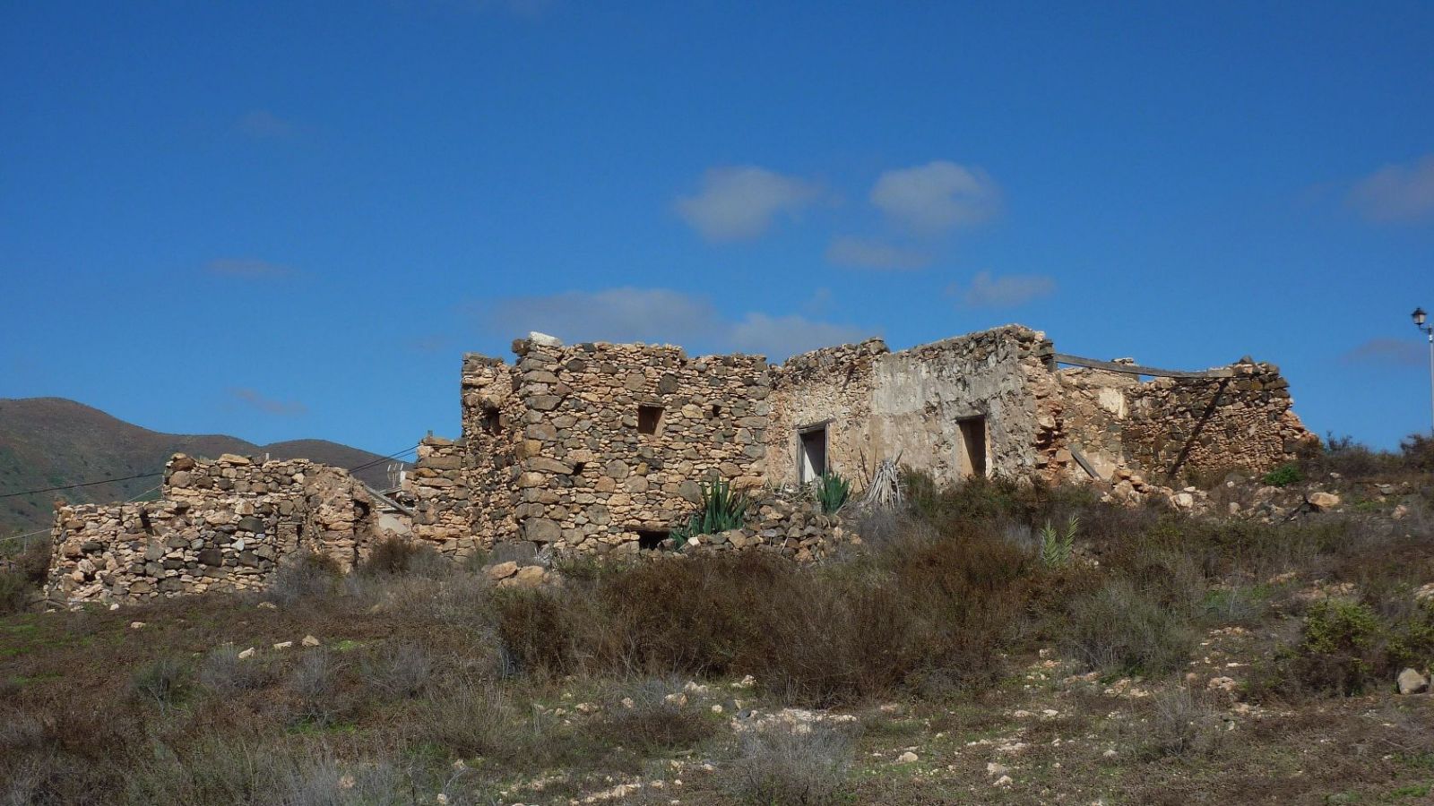Am (01) Start und Ziel (242 m) gehen wir zunächst auf der Anfahrtsstraße 30 m zurück, um dann der Schotterpiste links herunter in südliche Richtung zu folgen. Vorbei geht es an rechts von uns liegenden Ruinen und weiter parallel zu einem links von uns liegenden Barranco. Bei der folgenden Weggabelung, 20 m vor einem Wasserauffangbecken, lassen wir den rechten Abzweiger liegen und bleiben auf dem Hauptweg. Wir erreichen ein Barranco. Rechts bei einem großen Stein führt eine größere Schotterstraße leicht bergauf, wir gehen jedoch links im Barranco weiter. Der Weg führt an einem weißen Haus vorbei und rechts vom Weg liegen viele Tomatenplantagen. Nach starken Regenfällen ist der folgende Wegabschnitt direkt im trockenen Flussbett schwer auszumachen.