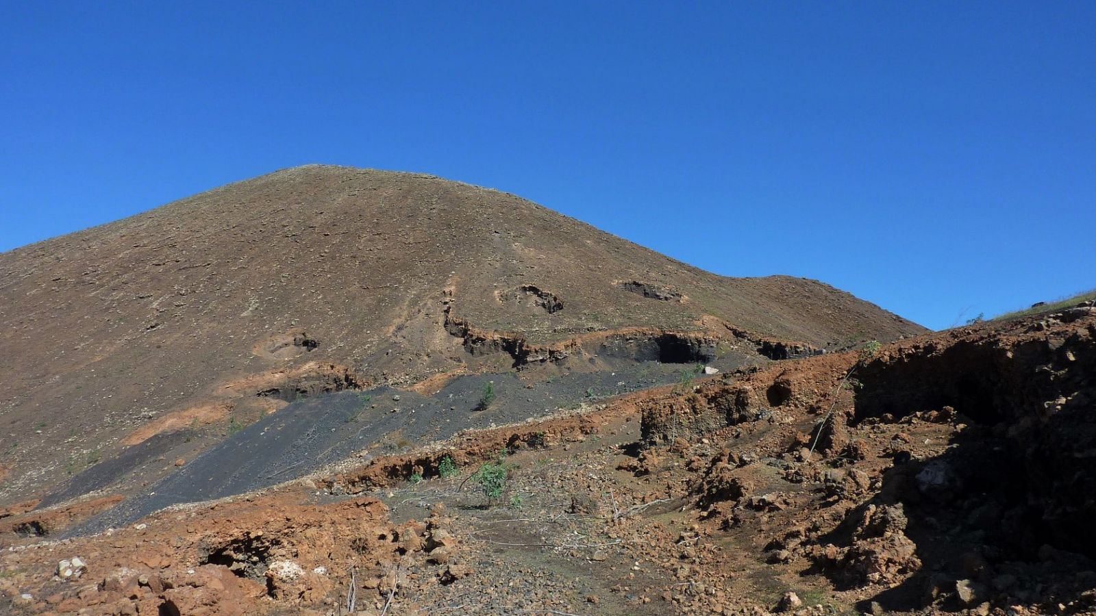Nach einigen Teilstücken Blockkletterei haben wir den schwierigsten Teil der Wanderung geschafft. Auf einem aussichtsreichen Pfad wandern wir bis zum Gipfel der (05) Caldera de Gairia (461 m). In südliche Richtung beginnen wir den weglosen Abstieg, bis wir uns auf Höhe des unteren südlichen Kraterrands befinden. Wir treffen auf den Pfad, der die südliche Flanke quert. Bei dieser Einsattelung gehen wir halb rechts 100 m in westliche Richtung und verlieren dabei leicht an Höhe, bis wir uns 25 m oberhalb eines großen Erosionseinbruchs befinden. Vereinzelte Steinmännchen markieren den nachfolgenden Pfad, der nun links an dem Erosionseinbruch vorbeiführt. An einem zweiten Erosionseinbruch geht es an seiner rechten Seite vorbei, bevor wir durch eine ca. 5 m breite Öffnung in flacheres Gelände gelangen. Der nächste Orientierungspunkt ist die 150 m entfernte Schotterstraße. Dort angekommen, führt die Schotterstraße rechts zurück zum Ausgangspunkt.