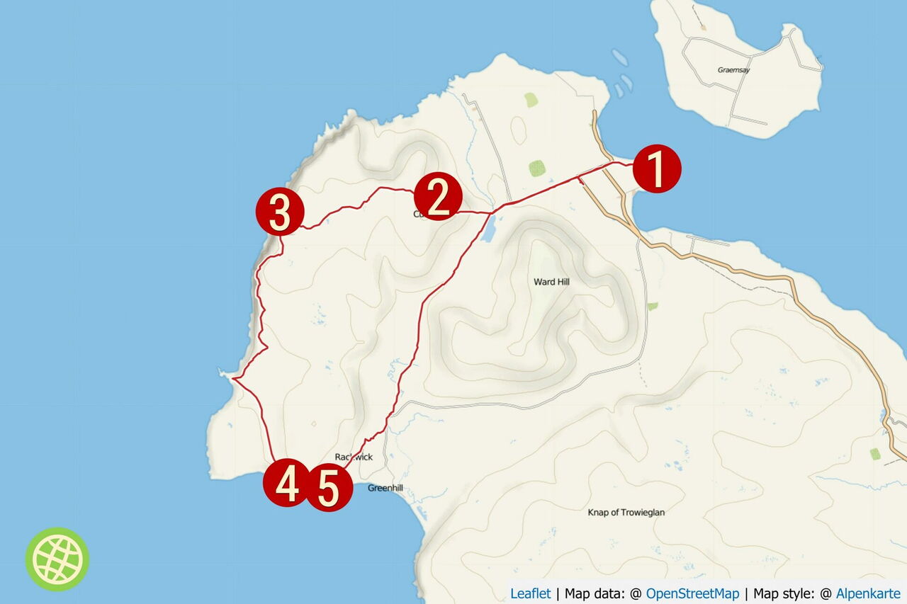 Pkw-Anfahrt: Der Start befindet sich 24 km westlich der Hauptinsel Mainland auf den Orkney-Inseln. Auf dem Hafengelände gibt es kostenlose Parkplätze. Geokoordinaten: 58.963192 -3.296870. Busanbindung: alle wichtigen Buslinien. Dann geht es mit der Fähre weiter. Fähre: Sommerfahrplan (von Anfang Mai bis Ende September) Stromness Orkney Ferry Terminal nach Moaness North Hoy Orkney Ferry Terminal, Montag bis Freitag 7:45–8:10, Wochenende 9:30–10:00. Moaness North Hoy Orkney Ferry Terminal zum Stromness Orkney Ferry Terminal Montag bis Freitag 12:40–13:05, 16:30–16:55, 18:15–18:40 und am Wochenende 16:30–16:55. Bitte entnehmen Sie die aktuellen Fahrpläne der Webseite https://bustimes.org/services/of1-stromness-north-hoy-and-graemsay?date=.